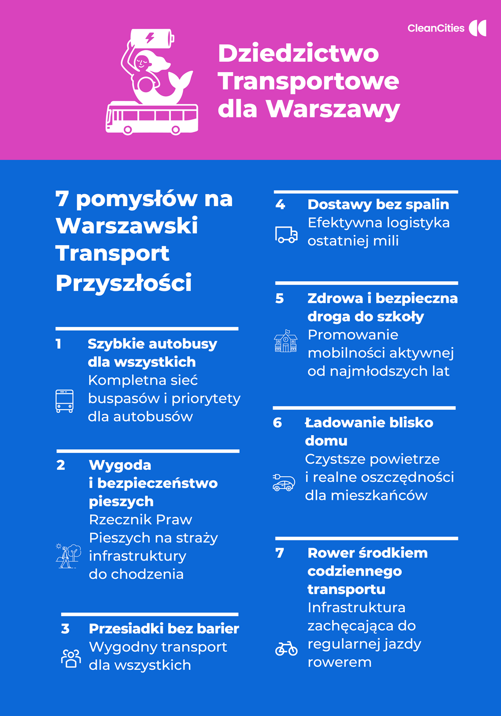 „7 pomysłów na Warszawski Transport Przyszłości” to efekt pracy szerokiej koalicji, w której oprócz Clean Cities Campaign znalazły się: Bike Festival Warszawa 2025, Fundacja Na Miejscu, Fundacja Promocji Pojazdów Elektrycznych, Fundacja ZACZYN, Health and Environment Alliance, Instytut Na Rzecz Ekorozwoju, Lata Dwudzieste, Lepszy Służewiec, Partnerstwo dla Bezpieczeństwa Drogowego, Polski Klub Ekologiczny, Polskie Stowarzyszenie Nowej Mobilności (PSNM), Rodzice dla Klimatu, Stowarzyszenie Ekologiczne EKO-UNIA, Zielone Mazowsze, Instytut Ekologii Akustycznej, Rodzic w Mieście oraz agencja Profeina.