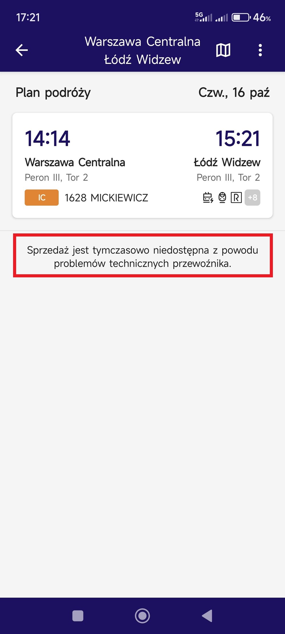 – W systemie sprzedaży e-IC oraz w kanałach USS 2017: Bilkom, Koleo, u agentów, a także w biletomatach została zdiagnozowana usterka powodująca brak możliwości zakupu biletu online – przekazał w