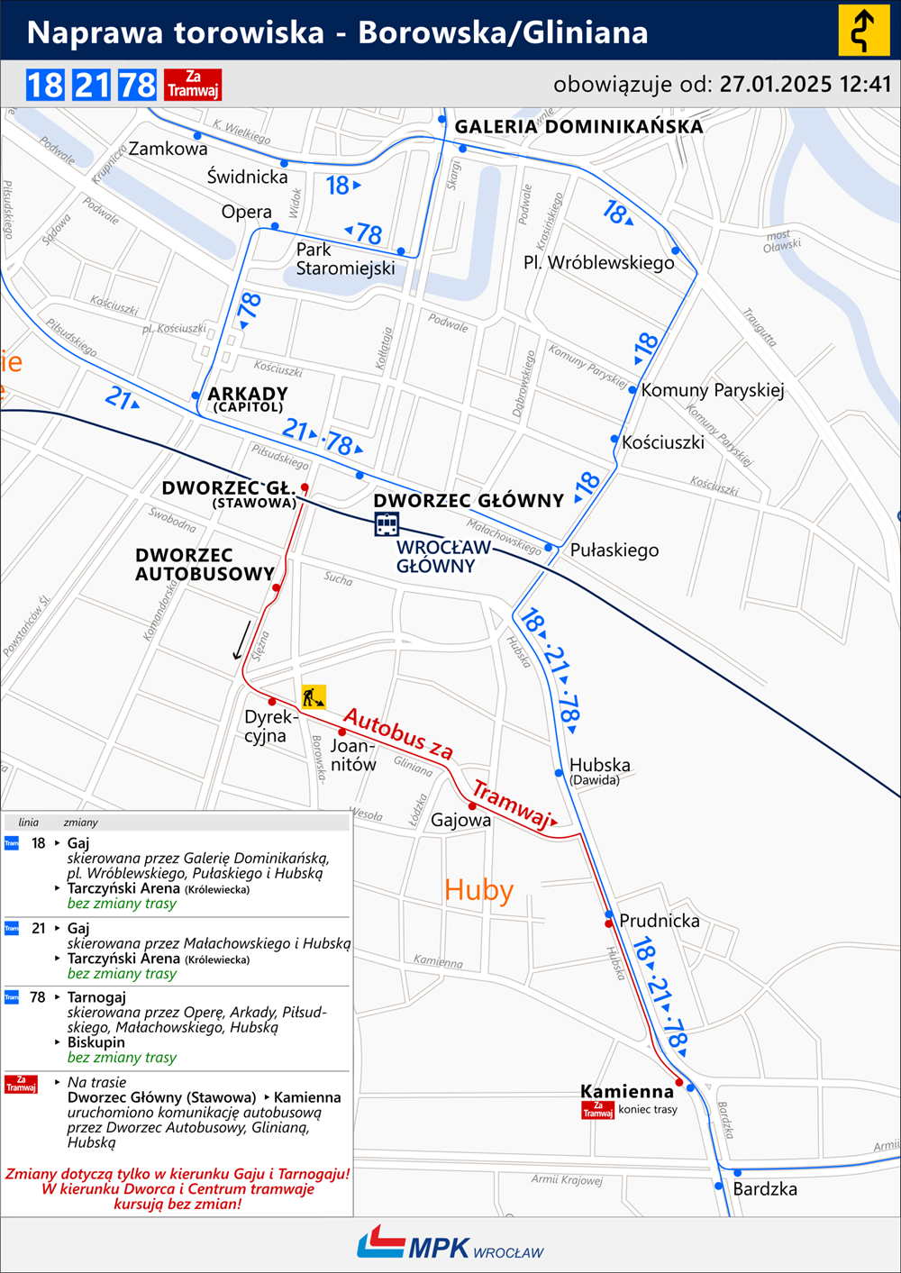 Tramwaje linii 18 jadące w kierunku Gaju będą jechał wzdłuż ul. Kazimierza Wielkiego do pl. Dominikańskiego, dalej do pl. Wróblewskiego, a następnie ul. Pułaskiego do ul. Hubskiej;