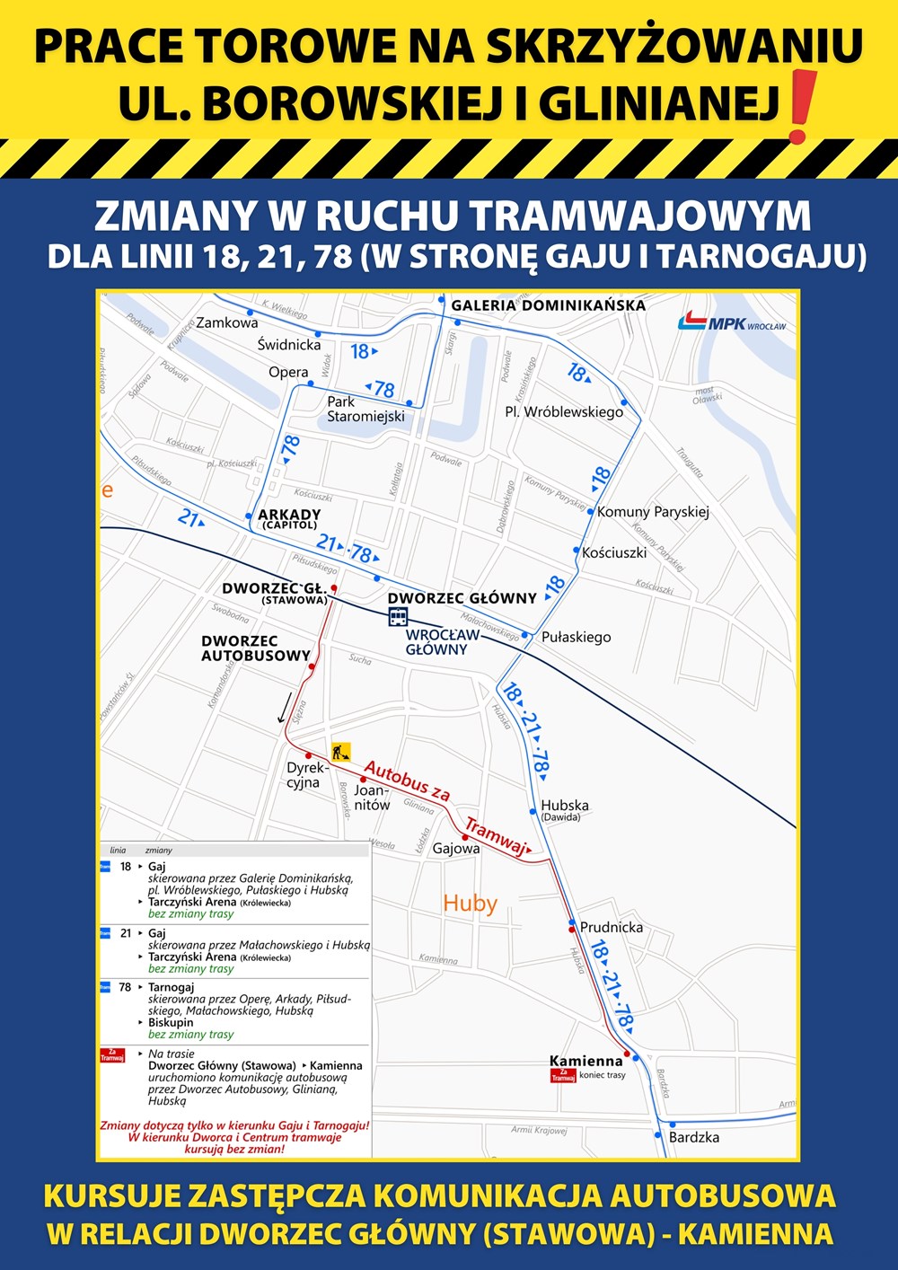 MPK Wrocław uruchomi autobusową komunikację „za tramwaj”, która będzie kursować w relacji od przystanku Dworzec Główny (Stawowa) do przystanku Kamienna.