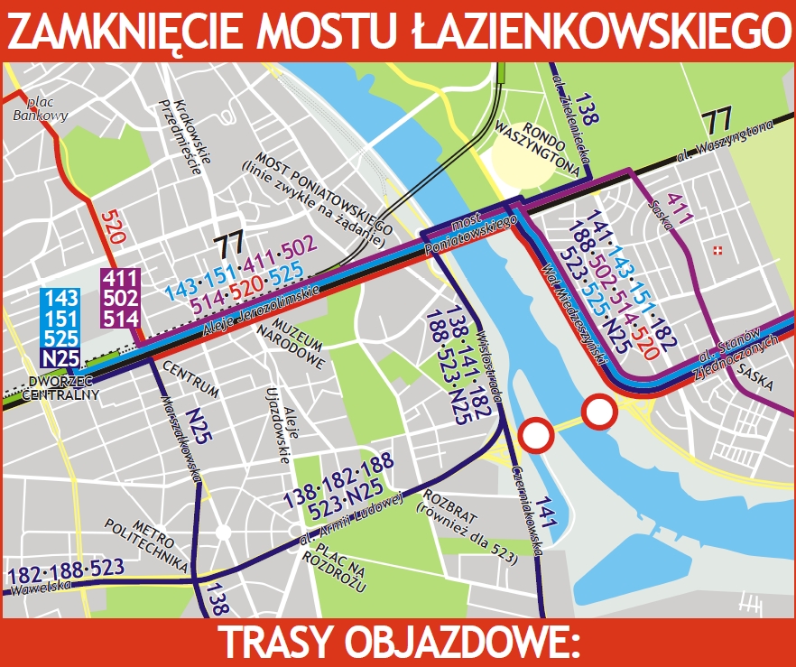 Nieczynny Most Łazienkowski oraz sąsiedni Most Poniatowskiego pełnią kluczową funkcję dla obsługi komunikacyjnej Pragi Południe, a także, przynajmniej w części, innych prawobrzeżnych dzielnic. Już od dawna jednak ich potencjał tkwi przede wszystkimw wydajnym transporcie publicznym. Most Poniatowskiego posiada wydzielone torowisko tramwajowe oraz uzupełniające linie autobusowe (w tym pospieszne). Most Łazienkowski posiada z kolei bardzo wydajny buspas, określany czasem trochę na wyrost mianem warszawskiego BRT. Wyłączenie tej przeprawy w całości z ruchu wiąże się z pytaniem, gdzie zmieścić ponad 70 autobusów na godzinę, które do tej pory zapewniały sprawny dojazd Trasą Łazienkowską do Metra Politechnika. Zatory uliczne, występujące na co dzień, mają tak naprawdę mniejsze znaczenie i przy tej skali utrudnień nie da się ich uniknąć. Stąd przeanalizujmy sytuację transportu miejskiego.