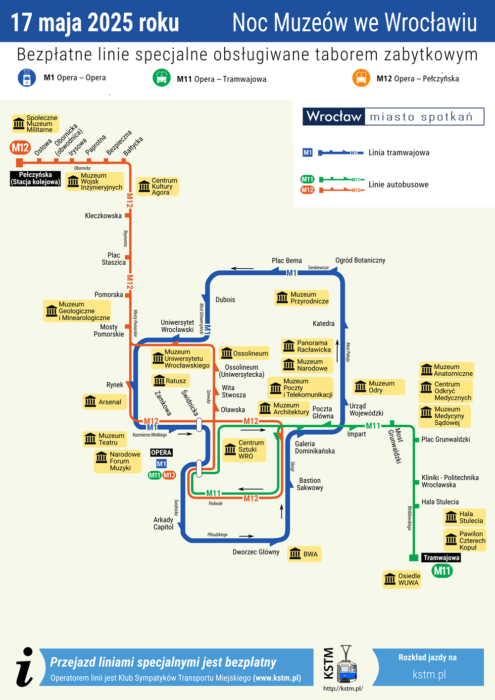 Linia tramwajowa M1 będzie okrążać centrum miasta, łącząc Operę, Dworzec Główny, Muzeum Narodowe, Ostrów Tumski i Uniwersytet Wrocławski. Z kolei linie autobusowe połączą Operę z Halą Stulecia, osiedlem WuWa i wystawą Golgota Wschodu (linia M11) oraz ze Społecznym Muzeum Militariów (linia M12). Punktem przesiadkowym dla wszystkich linii będzie pl. Teatralny, skąd zabytkowe pojazdy będą odjeżdżały co około 5 minut. W tym roku linie specjalne z okazji Nocy Muzeów będą kursowały z większą częstotliwością, tramwaje np. co 10 minut.
