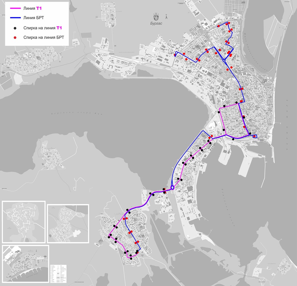 Linia T1 działała tylko do 29 sierpnia 2022 r., kiedy to zawieszono ją na czas nieokreślony. Wpływ na tę decyzję miały mieć również remonty dróg, a w szczególności ulic Průmyslové i Čataldža. Na podstawie wyników z pomiarów ruchu ustalono, że trasa zostanie wznowiona na początku 2023 roku, jednak nie przy użyciu trolejbusów, a autobusów spalinowych i to tylko w dni robocze. Przyszłość trolejbusów pozostawała więc niepewna, zwłaszcza w kontekście zakupów autobusów elektrycznych, na które miasto się zdecydowało dzięki środkom unijnym. Do Burgas miało dotrzeć 56 nowych pojazdów.