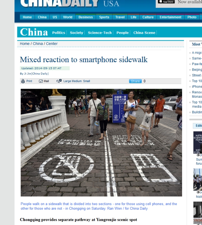 50–metrowy fragment chodnika w prawie 5–milionowym Chongging nie zmienił może radykalnie sposobu poruszania się po mieście, ale zyskał zainteresowanie mediów. Wyznaczony został przy ulicy chętnie odwiedzanej przez turystów, bo mieszczą się przy niej kopie europejskich budynków. Ale zwiedzający często zamiast patrzeć pod nogi albo na budynki, gapili się w ekran smartfona, lub tabletu. – Wydało się nam to potencjalnie niebezpieczne – twierdzi Long Cheng, rzeczniczka dewelopera zarządzającego miasteczkiem, która wpadła na pomysł odseparowania ruchu pieszego, od ruchu smartfonowego.