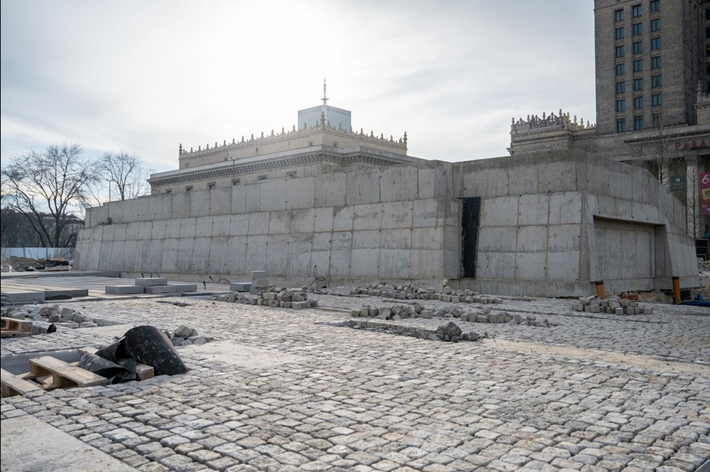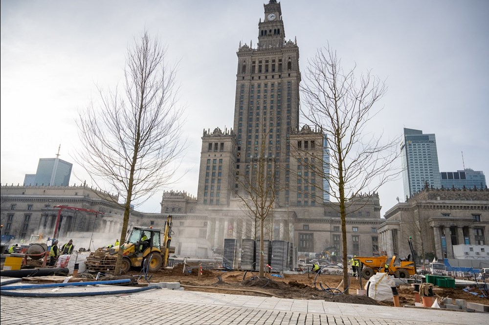 Nasadzenia zieleni to oczywiście nie jedyne prace, które trwają na powstającym placu Centralnym. Kształtu nabiera odbudowywana trybuna honorowa. To właśnie z niej w przeszłości przemawiał m.in. Władysław Gomułka, a przez lata stanowiła charakterystyczny punkt placu Defilad. Po dekadach zaniedbań i rozbiórce powstaje nowa, symboliczna konstrukcja, która ma nawiązywać do oryginalnej formy. Trybuna także zostanie zazieleniona – będzie można na niej odpoczywać i podziwiać z niej otoczenie. W wielu miejscach placu Centralnego można już zauważyć nową, kamienną nawierzchnię, która pojawiła się także w sąsiedztwie Pałacu Kultury i Nauki. Prace budowlane prowadzone są bardzo intensywnie – każdego dnia na miejscu działa kilkadziesiąt osób oraz ciężki sprzęt.