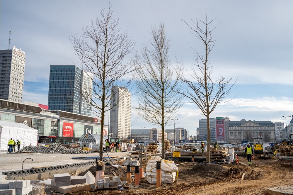 Ciepła zima sprzyja pracom na placu Centralnym, gdzie trwa nie tylko układanie nawierzchni, ale sadzone są także kolejne drzewa. Na wiosnę, kiedy plac zostanie oddany do użytku, mieszkańcy zyskają kolejne zielone miejsce spotkań i wypoczynku w Nowym Centrum Warszawy.