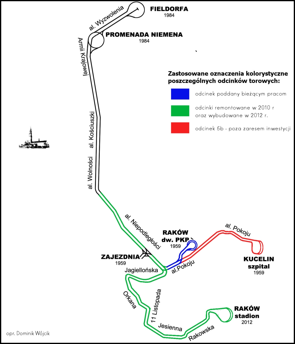 Ze starego szlaku nietknięty pozostanie odcinek w alei Pokoju od pętli Raków-PKP do pętli Kucelin, określony w dokumentacji jako „5b”. Przebudowa tego fragmentu została wydzielona z całości projektu celem obniżenia ceny tej potrzebnej inwestycji. Decyzję podjęto biorąc pod uwagę stosunkowo niewielkie obłożenie podróżnymi. Odcinek „5b” został opracowany odrębnie i zgłoszony do finansowania unijnego wraz z zakupem 5 kolejnych składów tramwajowych, jednak zgodnie z przeczuciami autorów, przepadł on w konkursie. Z kolei główny wniosek (odcinki z oznaczeniami od 1 do 5a wraz z 10 tramwajami) uzyskał dofinansowanie z funduszy europejskich w kwicie 144 mln zł (wobec 205 mln całego kosztu).
