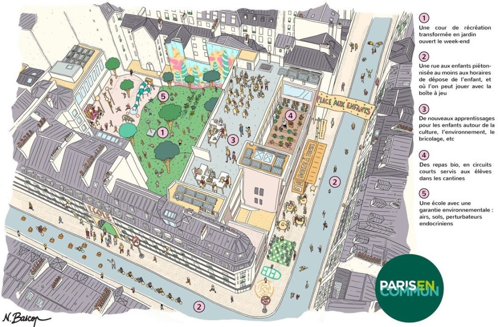 Rządząca Paryżem od 2014 r. Hidalgo ruszyła z kampanią pod wieloznacznym hasłem „Paris En Commun”, co można przetłumaczyć jako „Wspólny Paryż”, ale też „Paryż, który łączy”. Jej głównym punktem jest koncepcja „Ville Du Quart D’Heure”, czyli „kwadransowego” lub „piętnastominutowego” miasta.
