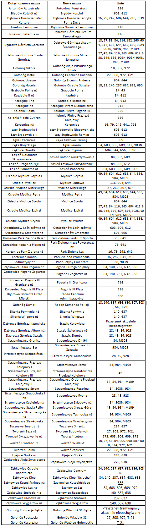Na swojej stronie internetowej Zarząd Transportu Metropolitalnego opublikował tabelę, w której zaprezentowały zostały zmiany. Uwzględniono w niej nie tylko dotychczasowe i nowe nazwy przystanków, ale także 39 linii autobusowych, które obsługują poszczególne stanowiska.