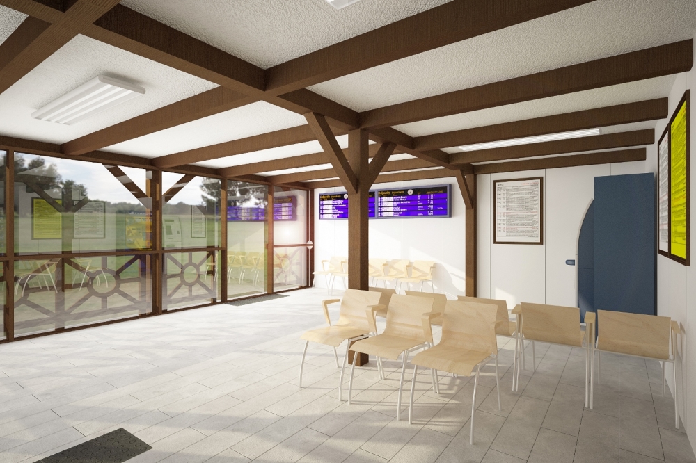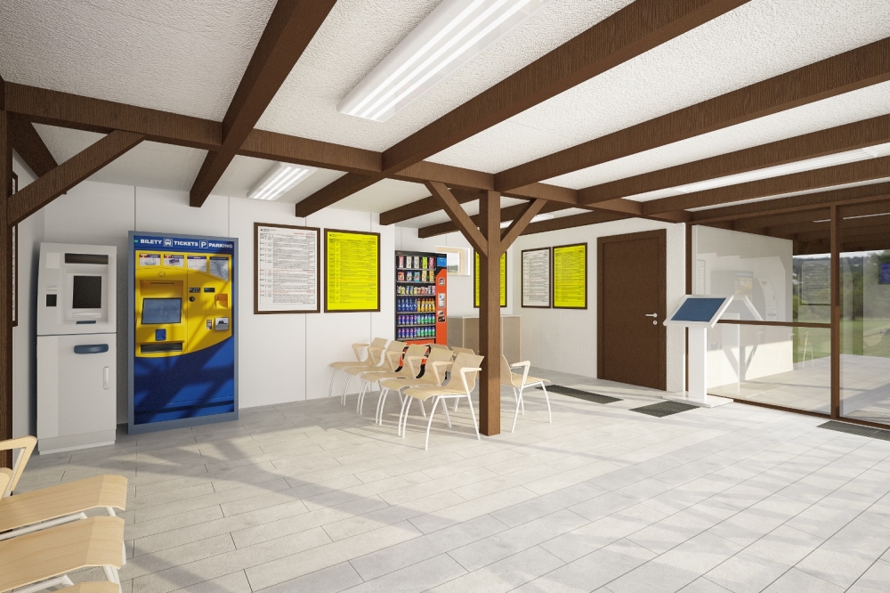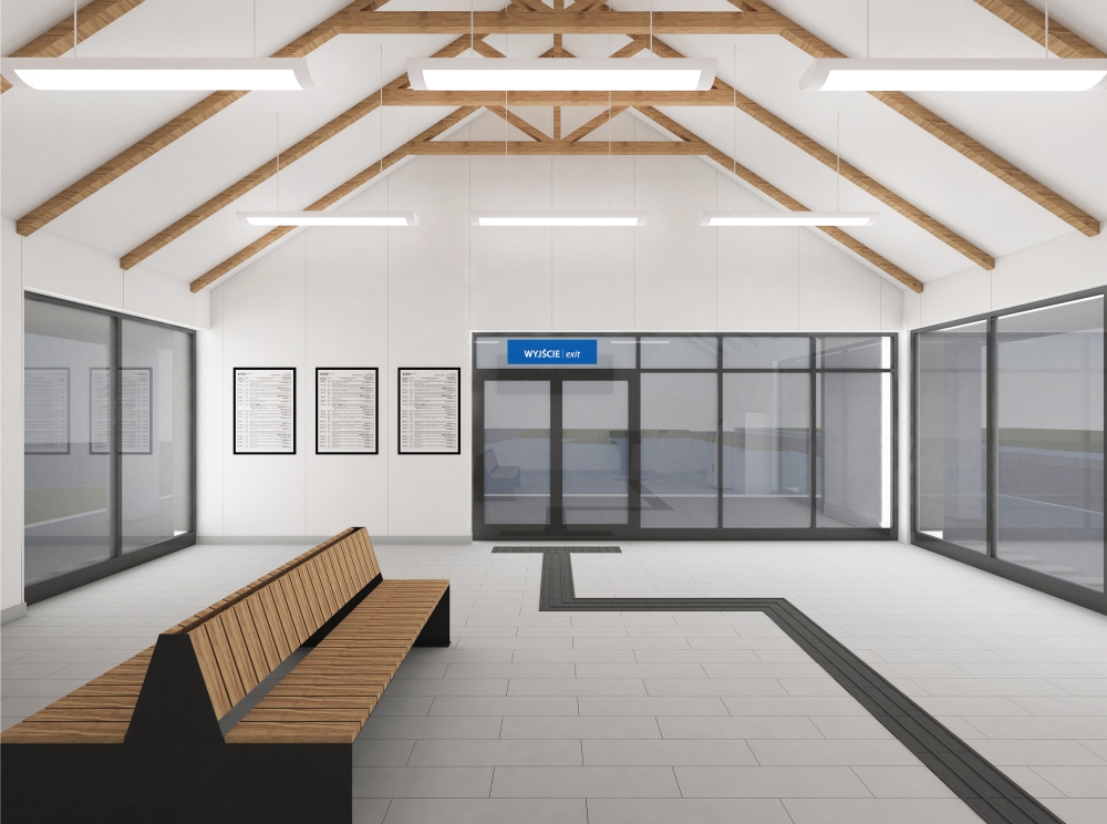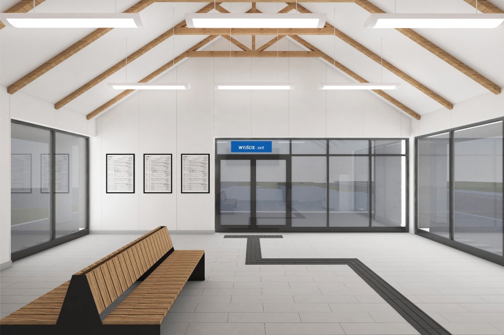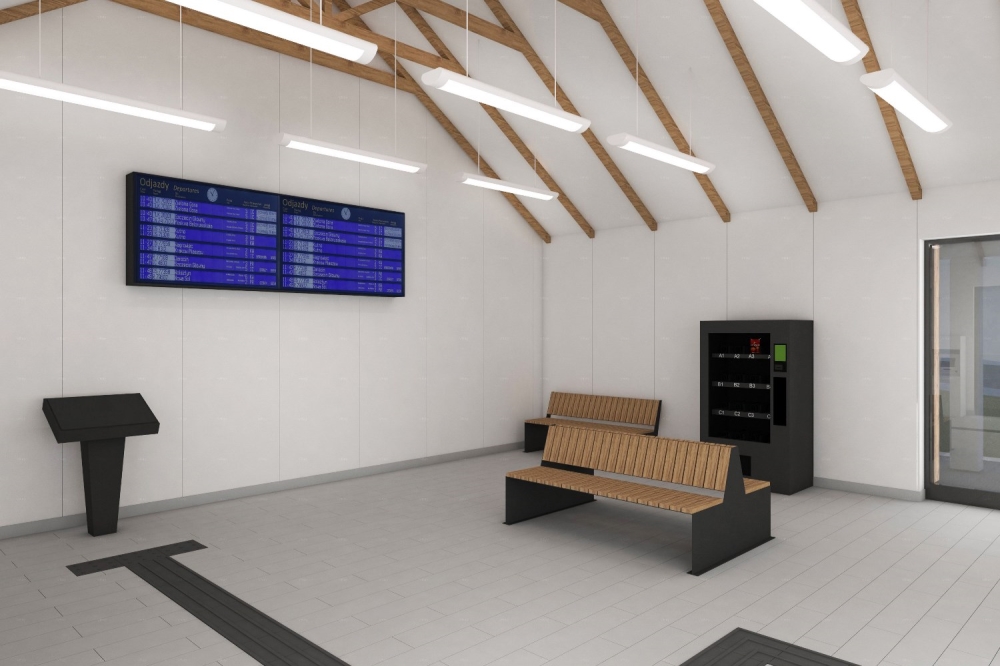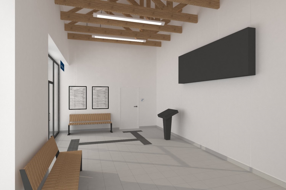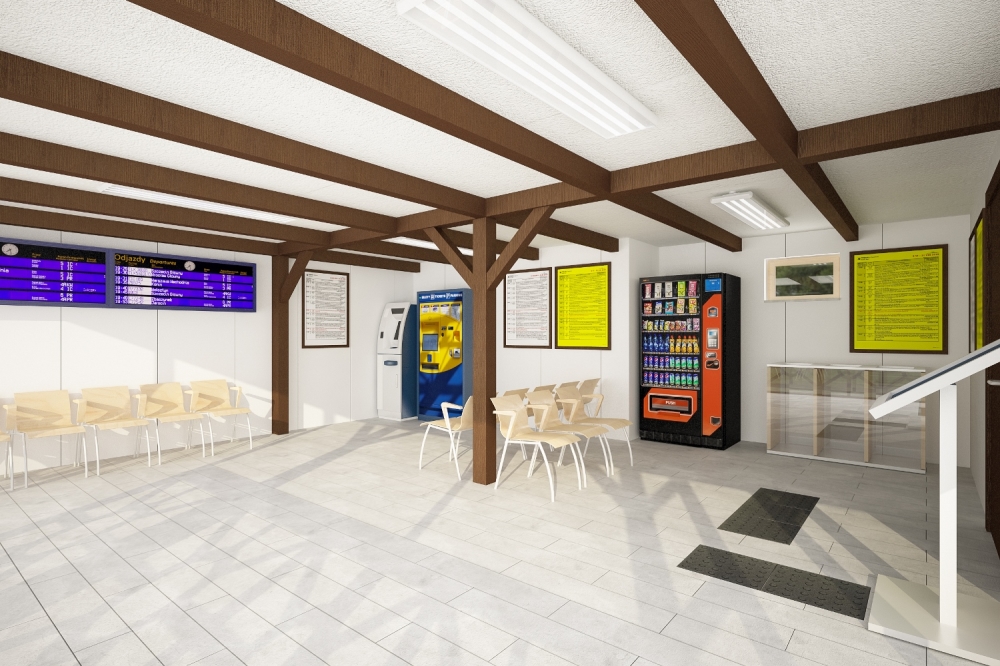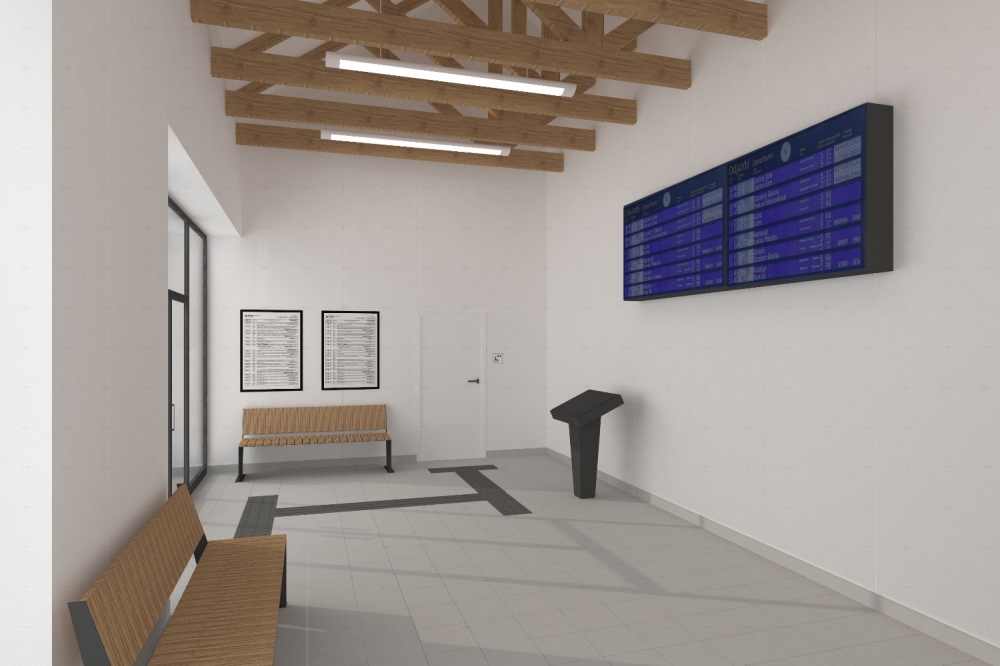 Dworzec Żegiestów-Zdrój, mat. PKP SAStrefa obsługi podróżnych połączy w sobie nowoczesność z historią. Wnętrze będzie utrzymane w szarościach i bieli, która jest pożądana w nowoczesnej architekturze. Poczekalnię doświetli duże przeszklenie od strony peronów. Nieco ciepła i historycznego charakteru wnętrzu dodadzą, wyeksponowane, ciemnobrązowe belki stropowe. Wnętrze zostanie wyposażone w ławki, gabloty, zegar oraz elektroniczne tablice przyjazdów i odjazdów pociągów. W pobliżu poczekalni znajdą się również toalety, a pozostałą przestrzeni dworca zajmą pomieszczenia techniczne.