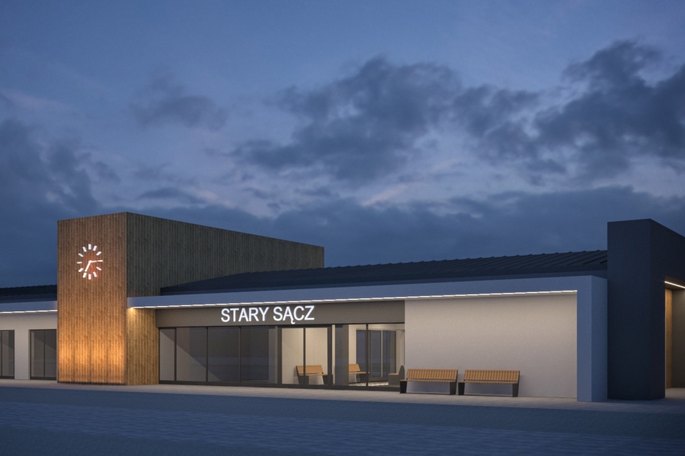 Stary dworzec (od)nowaOstatnim z sześciu obiektów przekazanych wykonawcy robót jest dworzec w Starym Sączu. Zostanie on kompletnie przebudowany. Choć zasadniczo wielkość dworca nie ulegnie zmianie to zmieni się jego wygląd zewnętrzny i wnętrze. Bryła dworca będzie bardziej geometryczna, z dominantą w postaci wieży zegarowej położonej w centralnej części budynku. „Lekkości” dworcowi nadadzą wielkopowierzchniowe przeszklenia umożliwiające dostęp światła dziennego. Reszta elewacji będzie wykończona okładziną drewnianą, bazaltową i jasnoszarym tynkiem.