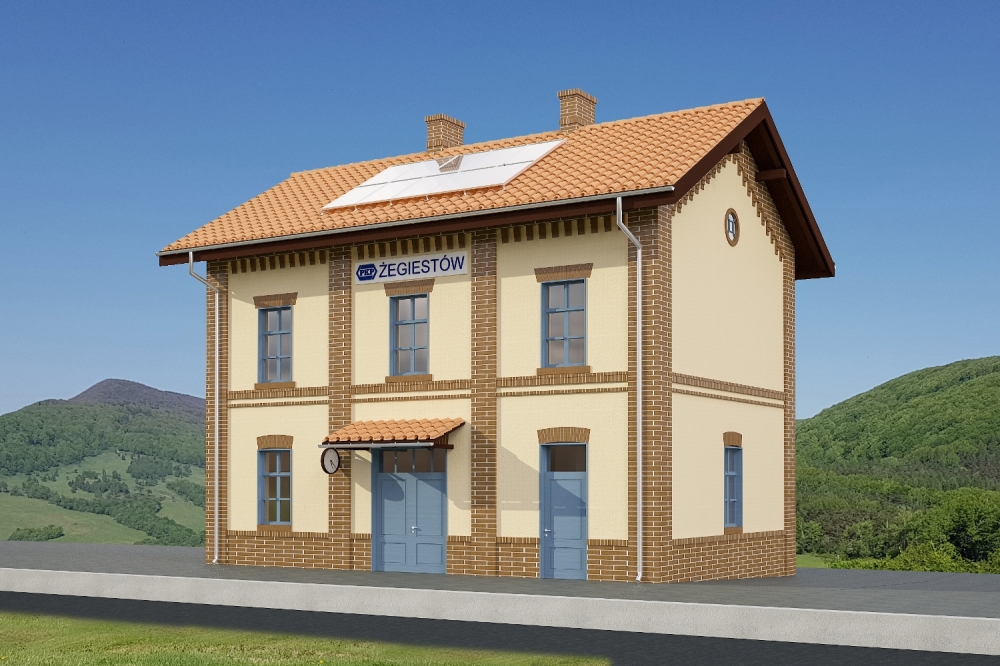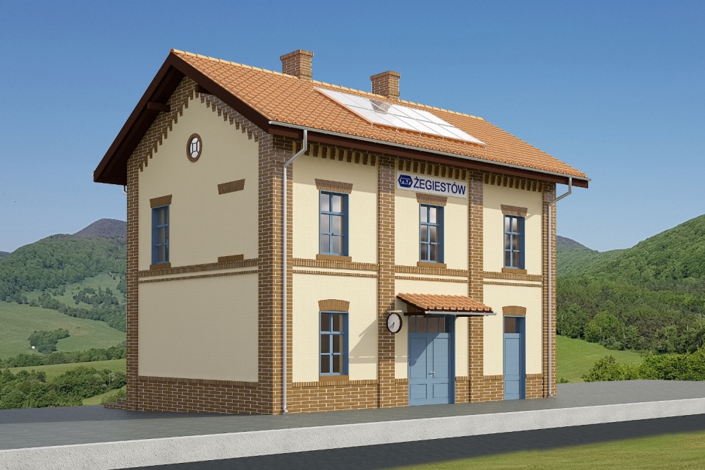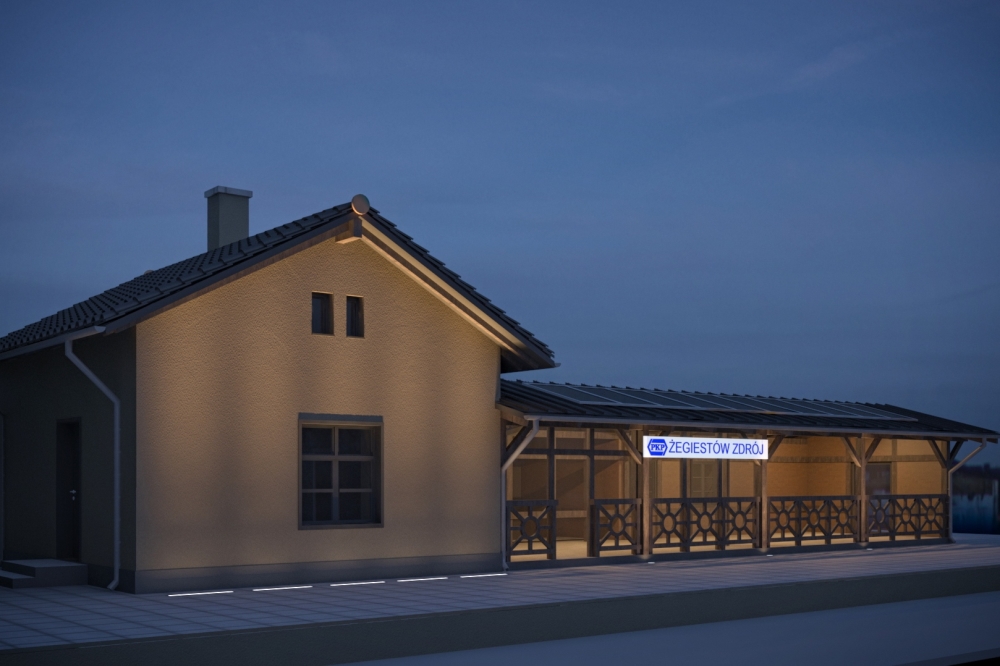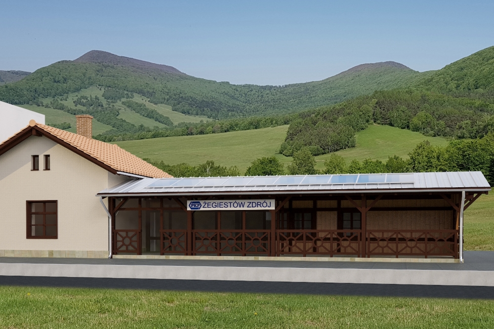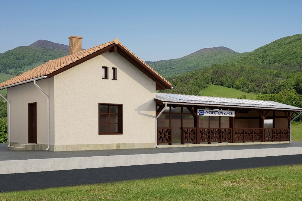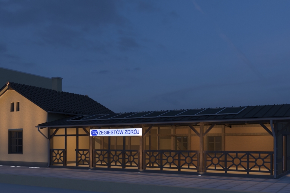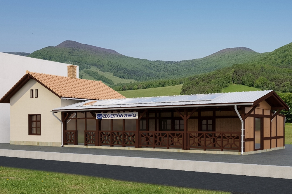 Klasyka z nutką nowoczesnościDworzec Żegiestów-Zdrój, wybudowany w 1876 roku, to najciekawszy pod względem architektonicznym obiekt tego typu w Dolinie Popradu. W ramach przebudowy historyczna bryła dworca pozostanie niezmieniona, ale metamorfozę przejdą wnętrze budynku i jego otoczenie. Wyższa część będzie pomalowana na jasny kolor, natomiast w niższej parterowej konserwacji zostanie poddana drewniana okładzina elewacyjna, a także wiata posiadającą ciekawą kolumnadę i ażurową balustradę. Nowością będzie jej częściowe przeszklenie, dzięki czemu zwiększy się przestrzeń obsługi podróżnych wewnątrz budynku. Pod pozostałą częścią wiaty znajdzie się poczekalnia letnia. Dworzec zyska również nową iluminację nocną podkreślająca bryłę budynku i przestrzeń wejściową od strony peronów.