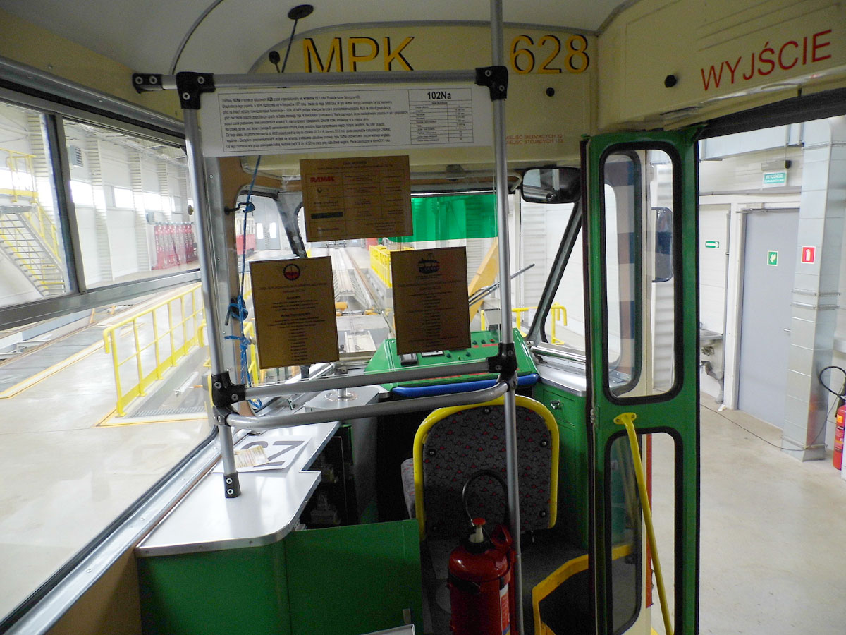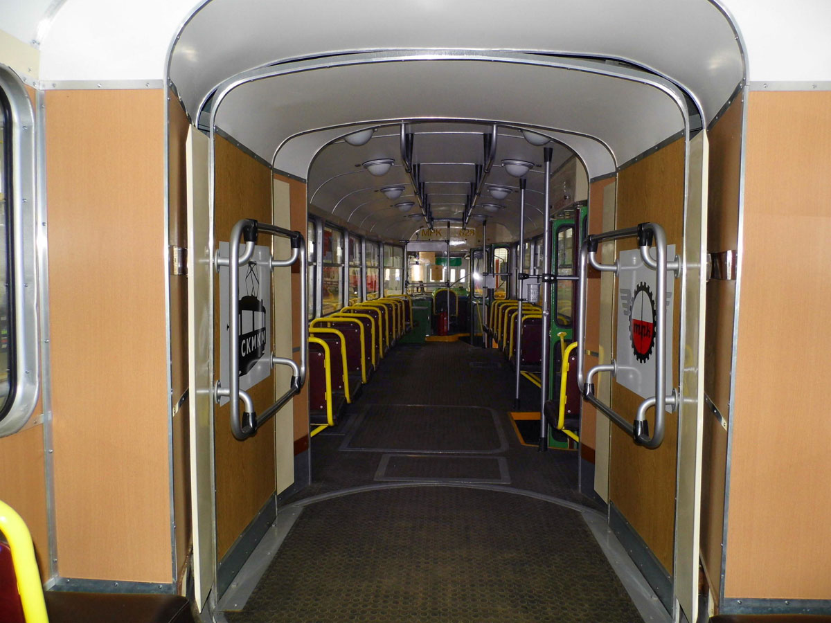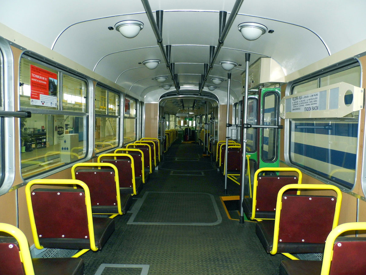 fot. Dominik WójcikWnętrze odzyskało historyczne wyposażenie: drewnopodobne laminaty, półkuliste plafony, poręcze nie pokryte farbą oraz charakterystyczne fotele – ich uchwyty w drodze wyjątku pokryto żółtą farbą. Wnętrze drzwi pokryto zielonym kolorem, podobnie jak wnętrze kabiny motorniczego.