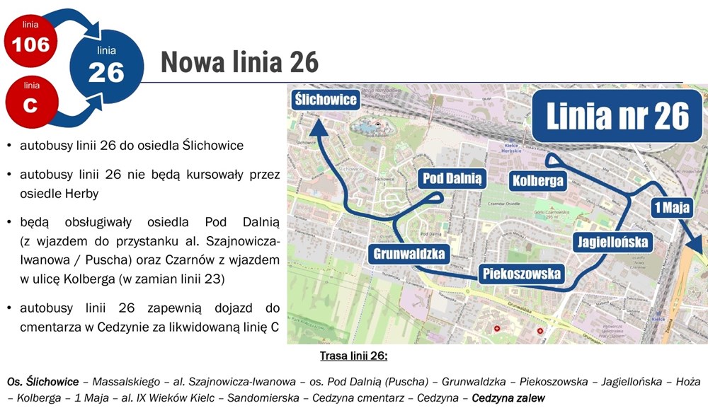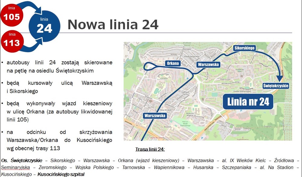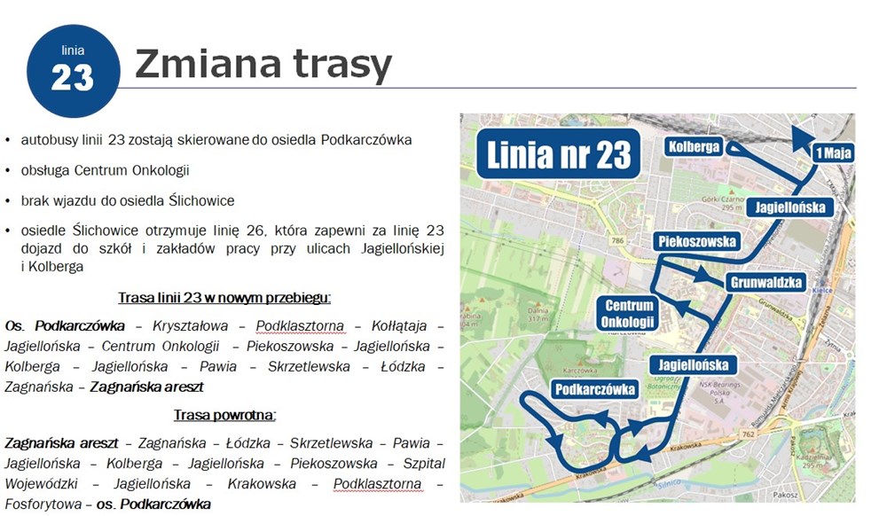 Autobusy linii 23 będą dodatkowo obsługiwały ulice Hożą i Kolberga, a linia 24 zostaje wydłużona do osiedla Świętokrzyskiego. Ponadto po zakończeniu przebudowy skrzyżowania ulic Karczówkowskiej z Jagiellońską zostanie rozważona możliwość skierowania autobusów linii 5 przez ulicę Karczówkowską i Mielczarskiego.