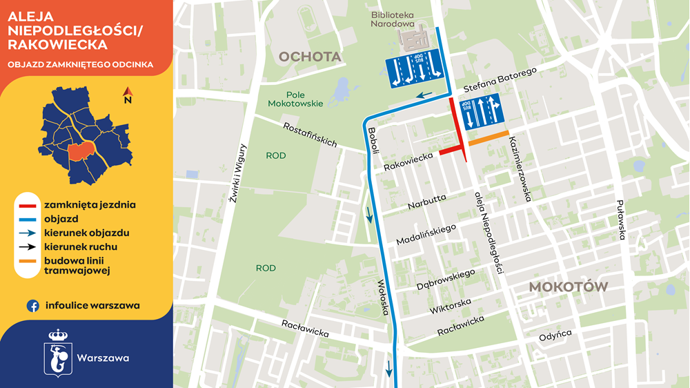 Od ostatniego weekendu kwietnia będzie zamknięta zachodnia jezdnia alei Niepodległości (w stronę Ursynowa), na odcinku od ulicy Stefana Batorego do Narbutta. Ruch w stronę Centrum będzie prowadzony dwoma pasami na wschodniej jezdni. Trzeci pas będzie prowadził w drugą stronę, ale zostanie zarezerwowany dla autobusów, pojazdów dopuszczonych (DOP) i pojazdów dojeżdżających do posesji położonych wzdłuż alei Niepodległości. Objazd dla pozostałych kierowców wyznaczono dwoma trasami: ulicą Stefana Batorego do Puławskiej, oraz Batorego do Wołoskiej.