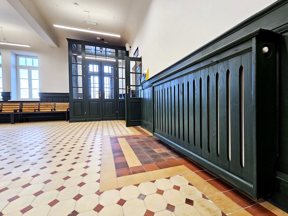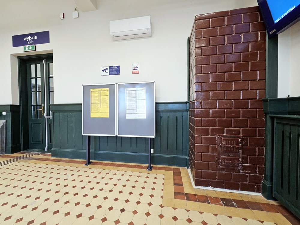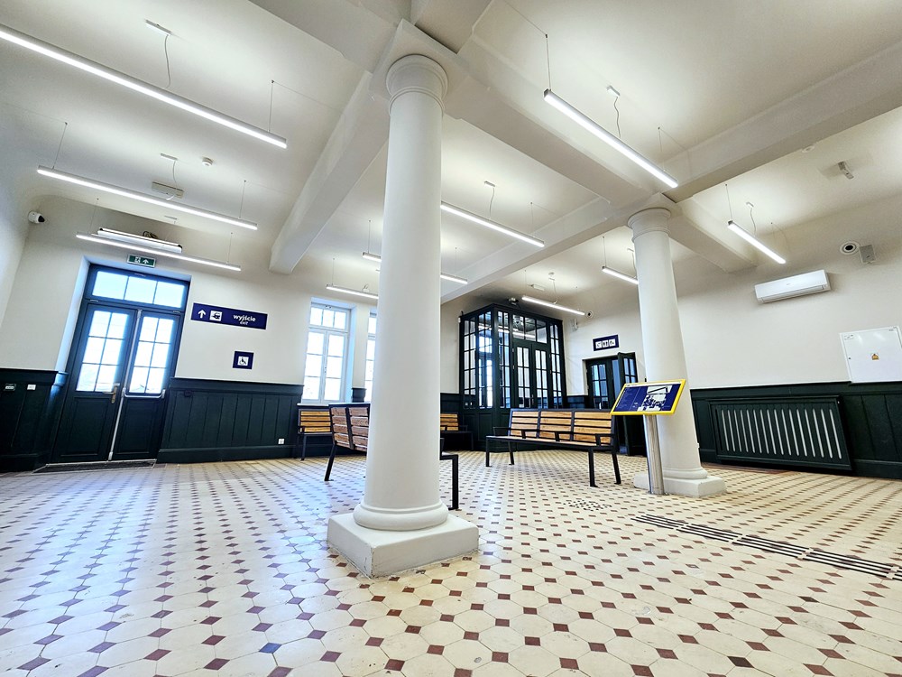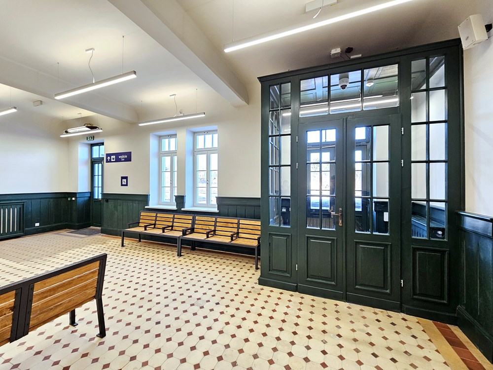 Na parterze znajduje się przestronny hol. W jego wystroju pozostawiono elementy zabytkowe, takie jak kremowa posadzka z czerwonymi wstawkami, dwie kolumny, drewniana boazeria na ścianach oraz poddane pieczołowitej konserwacji drewniane wiatrołapy przy obu wejściach do poczekalni. Ciekawostką jest historyczny kaflowy piec, który przeszedł renowację. Hol po przebudowie dworca jest w pełni ogrzewany i klimatyzowany, a także wyposażony m.in. w ławki, elektroniczne tablice przyjazdów i odjazdów pociągów, a także mapę dotykową dworca. Na parterze znajdują się także toalety oraz niewielki lokal komercyjny, a na piętrze budynku mieści się wynajęta przez samorząd przestrzeń z salą ślubów wraz zapleczem.