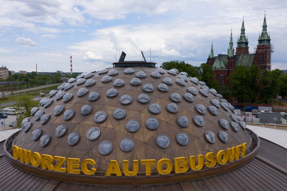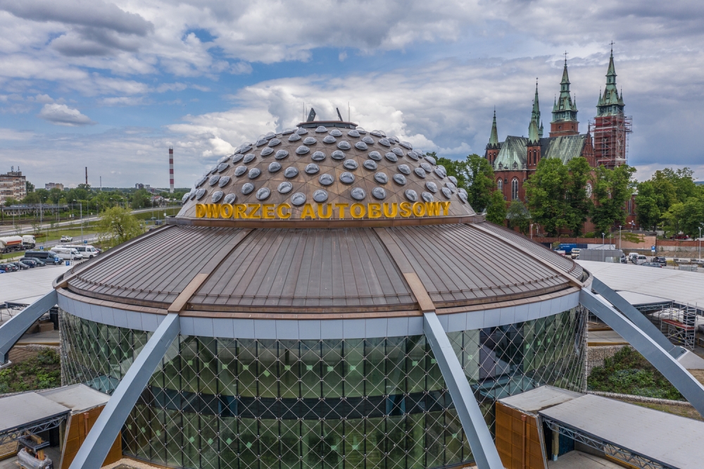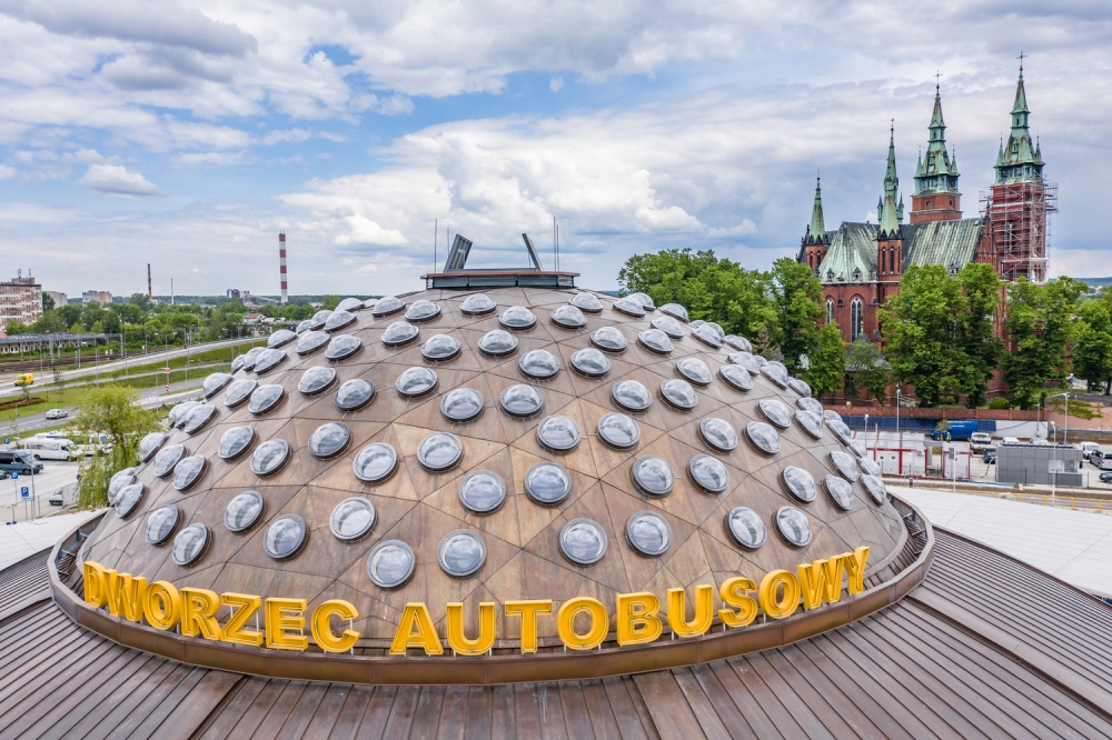 Dworzec został uruchomiony w 1984 r. Obiekt w formie spodka stał się charakterystycznym elementem panoramy Kielc. Budynek wyróżnia się swoją okrągłą formą, a zwłaszcza kopułą z wypustkami (lampionami). Na uwagę zasługują też rozwiązania komunikacyjne – autobusy jeżdżą niemal bezkolizyjnie wokół budynku dworca, do którego pasażerowie dostają się za pomocą przejść podziemnych. Obiekt od 2011 r. jest wpisany do gminnej ewidencji zabytków. Przez lata istniało ryzyko, że obiekt zniknie z pejzażu miasta, gdyż prywatny właściciel chciał go zburzyć bądź obudować centrum handlowym. Obiekt od kwietnia 2016 r. jest własnością miasta.