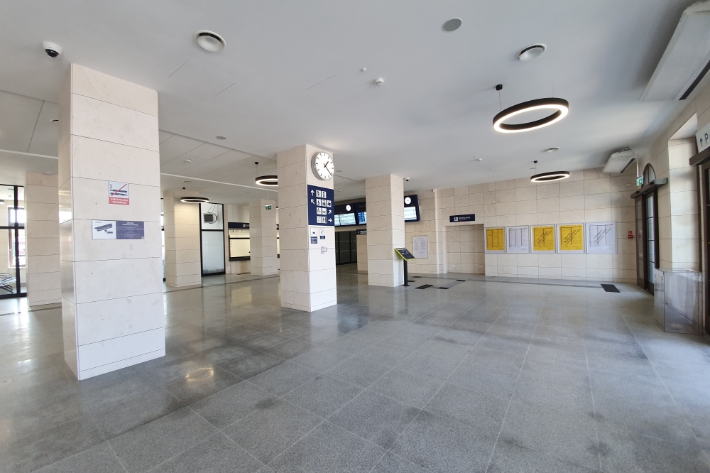 Renowacje przeszło również wnętrze budynku, które zyskało całkowicie nowy wygląd. W szczególności uwagę zwraca reprezentacyjny hol dworca połączony z poczekalnią zajmującą przeszło 350 m kw. parteru. Wykończono go w neutralnych kolorach w zgodzie ze współczesnymi trendami. Okładziny ścienne wykonano z wapienia, witryny lokali komercyjnych przeszklono, a na posadzkach położono szare granitowe płyty. Całość aranżacji uzupełniają nowoczesne we wzornictwie oświetlenie, a także ergonomiczne ławki. Uwagę zwracają również elektroniczne tablice przyjazdów i odjazdów pociągów, a także dotykowe tablice tyflograficzne z planem dworca. W sąsiedztwie holu zlokalizowano kasy biletowe, toalety, tzw. cichą poczekalnię oraz lokale komercyjne na wynajem. W zachodnim skrzydle budynku wykonano schody oraz windę, która po zakończeniu przez PKP Polskie Linie Kolejowe przebudowy peronów umożliwi wejście z tunelu bezpośrednio do holu dworca. Na pozostałych kondygnacjach budynku znajdą się przestrzenie biurowe dla spółek kolejowych oraz Izba Tradycji Kolejowej.
