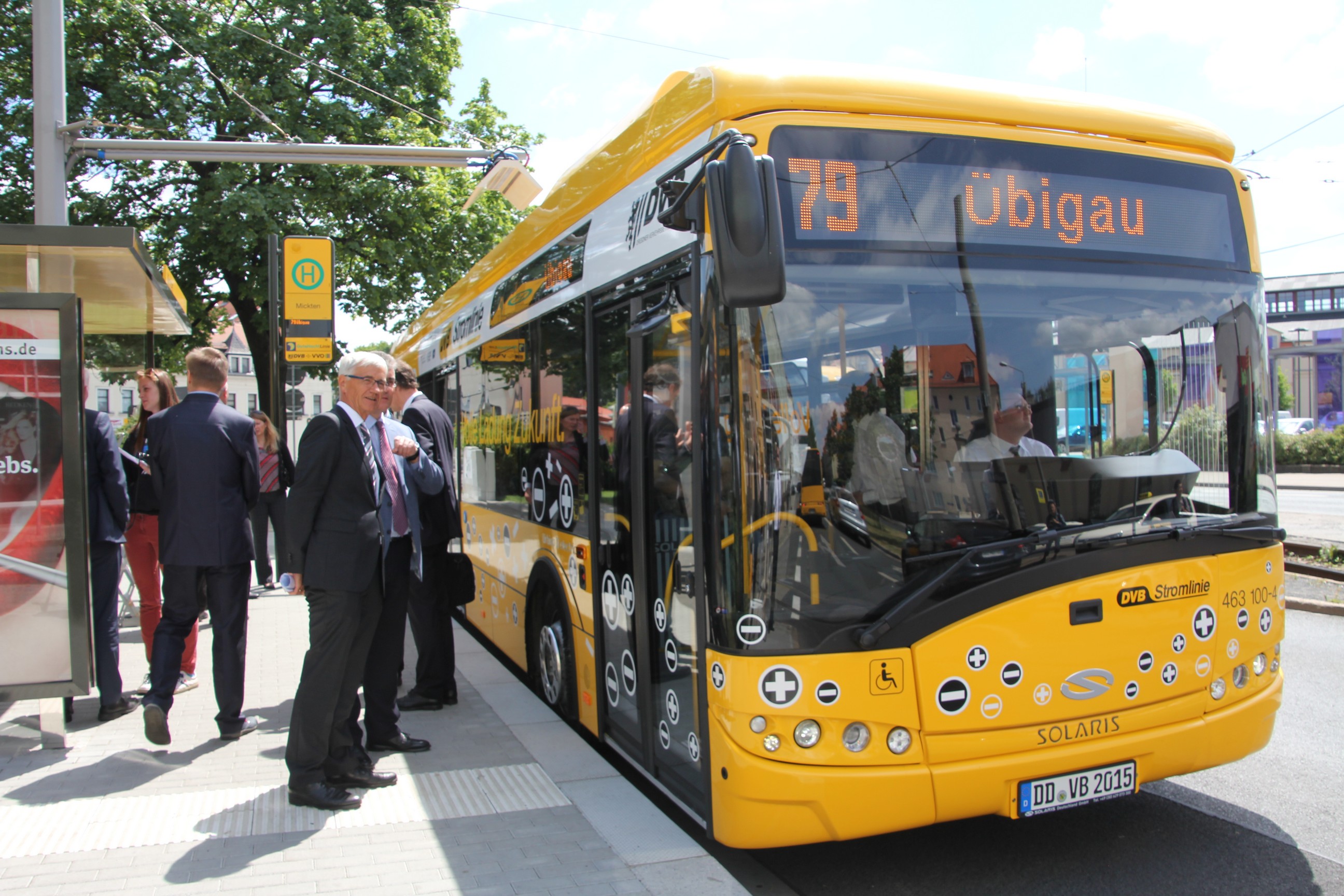 W środę (17 czerwca) w Dreźnie odbyła się prezentacja elektrycznego autobusu Solaris Urbino 12 electric. Po zakończeniu oficjalnych uroczystości pojazd ładowany za pomocą pantografu rozpoczął swój pierwszy regularny kurs pasażerski. Zakup bezemisyjnego Urbino to początek inwestycji DVB w bateryjne środki transportu publicznego.