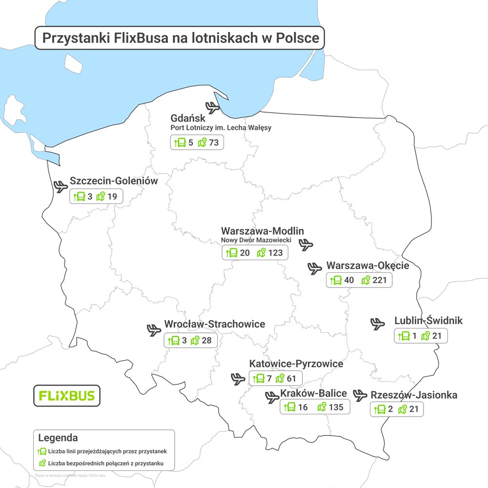 W Polsce FlixBus dysponuje rozbudowaną siecią połączeń lotniskowych, która pozwala podróżnym w prosty i komfortowy sposób zaplanować dojazd na swój lot. Aktualnie obejmuje ona ponad 70 regularnych oraz sezonowych linii, którymi można bezpośrednio dotrzeć do 9 portów lotniczych w Polsce. Przewoźnik obsługuje oba warszawskie lotniska – Chopina oraz Modlin, oferując połączenia z wielu miast w kraju oraz wybranych kierunków zagranicznych. FlixBus zapewnia również łatwy dostęp do portów lotniczych w Gdańsku, Szczecinie, Krakowie, Katowicach, Wrocławiu czy Rzeszowie, a także mniejszych lotnisk regionalnych, takich jak Lublin. Dodatkowo w siatce połączeń znajdują się bezpośrednie trasy między lotniskami, np. Warszawa Modlin – Lotnisko Chopina, Katowice – Wrocław, Katowice – Kraków czy Lotnisko Chopina – Gdańsk, co pozwala na sprawne przemieszczanie się pomiędzy portami lotniczymi. Z Polski można także bezpośrednio dojechać autobusami FlixBusa do zagranicznych lotnisk, m.in. w Berlinie, Budapeszcie czy Wiedniu.