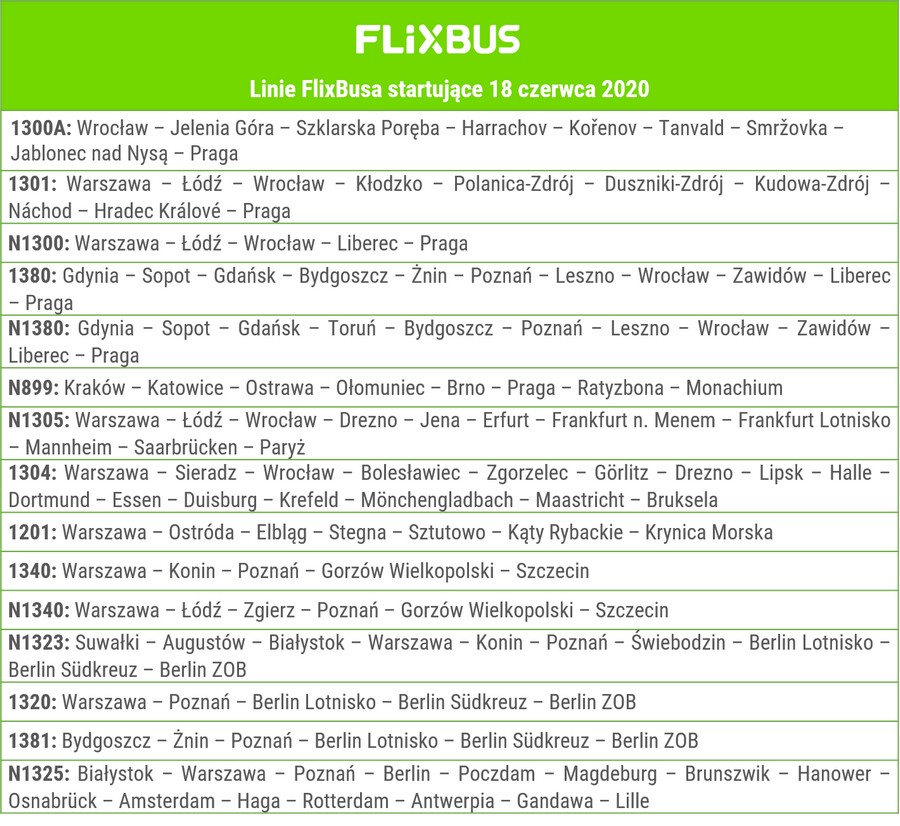 dokonanej na początku czerwca i obecnej siatka połączeń FlixBus Polska obejmie aż 130 miast. Poza nowymi liniami do Czech, Francji i Belgii, dojdą również nowe kierunki w Niemczech (m.in. Monachium), Holandii (m.in. Rotterdam), a także w Polsce, gdzie dodatkowo zwiększy się częstotliwość na głównych korytarzach obsługiwanych przez zielone autobusy.