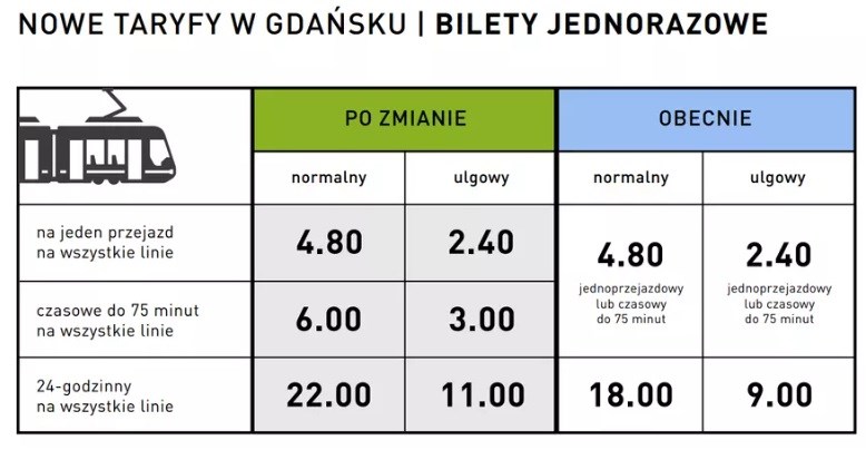 Ile wyniosą nowe stawki?W ofercie obowiązującej od kwietnia pojawi się bilet jednoprzejazdowy w cenie 4,80 zł, a także bilet przesiadkowy 75-minutowy w cenie 6 zł. Z nowym biletem pasażer będzie mógł korzystać z autobusów i tramwajów zatem przez 75 minut od momentu skasowania. Bilet pozwoli np. na swobodne przejechanie "od pętli do pętli". Cena biletu 24-godzinnego po zmianach wyniesie 22 zł, czyli 4 zł więcej niż dotychczas. Ceny biletów ulgowych wzrosną proporcjonalnie i wyniosą odpowiednio 2,40 zł (za bilet jednoprzejazdowy), 3 zł (za bilet 75-minutowy) i 11 zł (za bilet całodobowy).