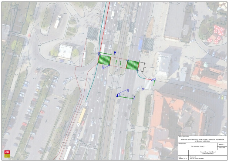 Wariant 1 (patrz rysunek nr 1) zakłada, że przejście powstanie niedaleko skrzyżowania z ul. Bogusławskiego w oparciu o istniejącą sygnalizację (choć bez dodatkowej sygnalizacji dla pieszych na przejściu przez torowisko: może być tu zastosowane sprawdzone rozwiązanie z pętli przy ul. Kartuskiej - gdzie o przejeździe pojazdu ostrzega sygnalizacja dźwiękowa “uwaga tramwaj” oraz sygnalizatory pulsujące).
