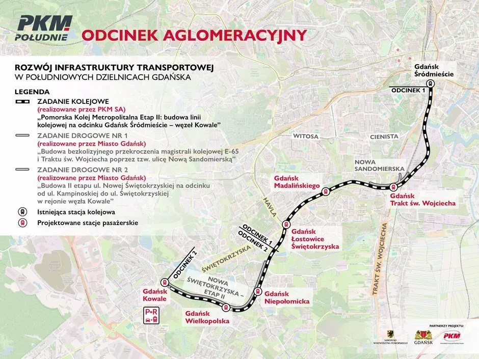Radna Katarzyna Czerniewska nazwała budowę PKM Południe gdańskim metrem, gdyż z całego siedmiokilometrowego odcinka, tak zwanego aglomeracyjnego, a więc prowadzącego z Gdańska Śródmieście do Kowal, jedynie kilkaset metrów będzie przebiegało w poziomie terenu, reszta będzie prowadzona po estakadach, w głębokich wykopach, a także pod ziemią, czyli w tunelach. Takie rozwiązanie wymusza ukształtowanie terenu. Przewyższenie od stacji Gdańsk Śródmieście do Kowal wynosi bowiem ponad 70 metrów. Ten siedmiokilometrowy odcinek będzie obsługiwany przez sześć przystanków. Dwa będą zlokalizowane na estakadach, dwa w wykopach, a dwa pod ziemią, tak jak metro.