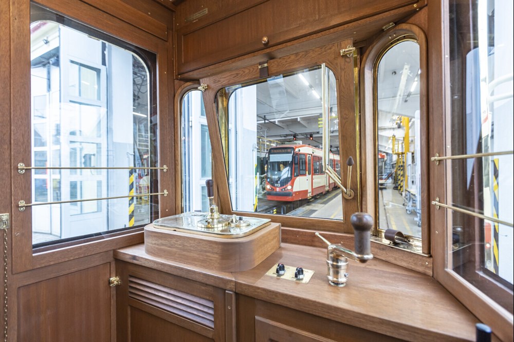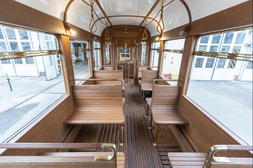 – W zakresie wnętrza tramwaju prace polegały na regeneracji bądź odtworzeniu oryginalnych elementów – informuje Zbigniew Riegel, przedstawiciel firmy 4iB. – Mosiężne elementy wykończeniowe zostały wypolerowane lub odtworzone na nowo w formie odlewów. Cała drewniana zabudowa wnętrza, m.in. ławki, obicie sufitu, obicia ścian, podłoga, zabudowy pulpitów sterowniczych, mechanizmy uchylania okien, czy drzwi przedziałowe zostały stworzone od nowa. Stolarka wnętrza, zgodnie z duchem epoki lat 20. XX wieku, wykonana została z drewna mahoniowego w kolorze brązowym.