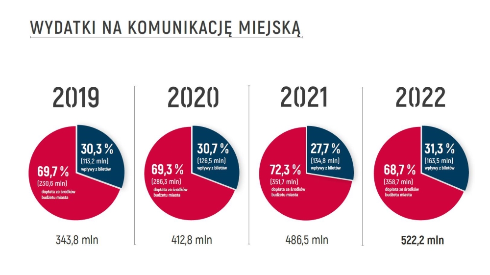 Wiceprezydent dołączył do swojego posta grafikę, z której wynika, że budżet na komunikację jest rekordowy, ale też, że wpływy z biletów stanowią tylko 31,3% całkowitych kosztów funkcjonowania komunikacji miejskiej. Grafika obejmuje 4 ostatnie lata i choć niewiele ponad 31% kosztów utrzymania komunikacji, jakie będą stanowić bilety w przyszłym roku jest bardzo małym procentem, to i tak widać, że jest to najlepszy wynik w ciągu ostatnich lat.