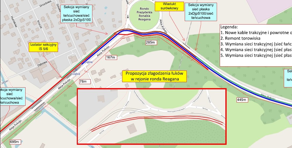 Poza wymianą torowiska, na nową zostanie również wymieniona cała sieć trakcyjna (od Gilowej do pętli wraz z całą pętlą) oraz wszystkie słupy trakcyjne. Końcówka na Kucelinie zostanie również w końcu oświetlona. Modernizacja obejmie również wszystkie platformy przystankowe znajdujące się na tym odcinku. Będą to więc dwa perony na przystanku Dąbie (w obu kierunkach), pojedynczy peron na przystanku końcowym Pętla Kucelin oraz dwa perony na przystanku początkowym o tej samej nazwie.
