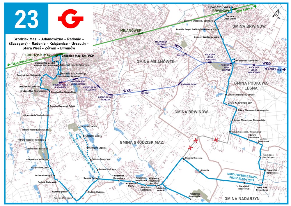 Planowane jest skierowanie linii 23 we wszystkich kursach przez Starą Wieś i ulicę Południową w Żółwinie. Od Urszulina autobusy pojadą ulicami Grodziską, Poziomkową, Brwinowską, Pieczarkową i Południową do Słonecznej. Nowa trasa linii 23 poprawi dojazd do stacji WKD w Podkowie Leśnej i PKP w Brwinowie mieszkańcom zarówno Starej Wsi jak i ulicy Południowej w Żółwinie. Przedstawiona propozycja jest efektem postulatów Mieszkańców i Władz Gmin.