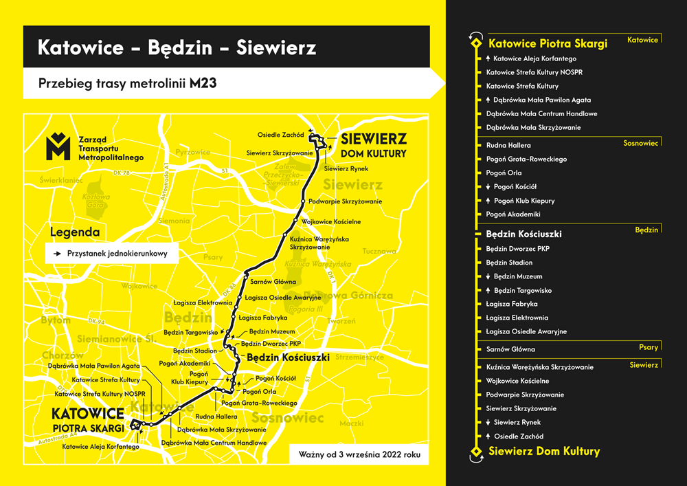 Trasa linii M23 w kierunku Katowice Piotra Skargi:Siewierz Dom Kultury 01 – Osiedle Zachód 01 – Siewierz Skrzyżowanie 03 – Podwarpie Skrzyżowanie 01 – Wojkowice Kościelne 01 – Kuźnica Warężyńska Skrzyżowanie 01 – Sarnów Główna 02 – Łagisza Osiedle Awaryjne 02 – Łagisza Elektrownia 02 – Łagisza Fabryka 02 – Będzin Targowisko 02 – Będzin Stadion 03 – Będzin Dworzec PKP 01 – Będzin Kościuszki 08 – Pogoń Akademiki 02 – Pogoń Klub Kiepury 01 – Pogoń Orla 02 – Pogoń Grota-Roweckiego 01 – Rudna Hallera 01 – Dąbrówka Mała Skrzyżowanie 02 – Dąbrówka Mała Centrum Handlowe 02 – Dąbrówka Mała Pawilon Agata 01 – Katowice Strefa Kultury 02 – Katowice Strefa Kultury NOSPR 01 – Katowice Aleja Korfantego 02 – Katowice Piotra Skargi 02