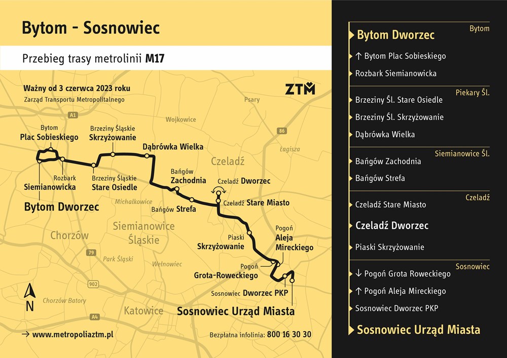 Linia M17, kursująca w relacji Sosnowiec Urząd Miasta – Bytom Dworzec, zapewni zwiększoną ofertę przewozową w Sosnowcu, Czeladzi, Siemianowicach Śląskich, Piekarach Śląskich i Bytomiu. Dodatkowo zapewni bezpośrednie połączenia Sosnowca ze strefą ekonomiczną w Bańgowie. Linia kursować będzie z częstotliwością co 30 minut w dni robocze oraz co 60 minut w dni wolne.