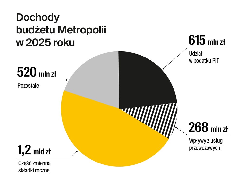 Po stronie dochodów w budżecie Metropolii uwzględniona jest również m.in. wysokość składki zmiennej, czyli środków wpłacanych przez gminy na realizację zadań związanych z obsługą komunikacji miejskiej. Wpływy z tego tytułu mają wynieść ok. 1,17 mld zł. Powiększą je również szacowane wpływy z tytułu świadczenia usług przewozowych, w tym m.in. ze sprzedaży biletów, które prognozowane są na poziomie ok. 268 mln zł.