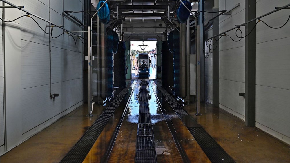 Wystarczy jeden pracownik, aby tramwaj był czysty z zewnątrz. Podjeżdża on wozem, wybiera program odpowiedni do typu pojazdu i przejeżdża przez myjnię.