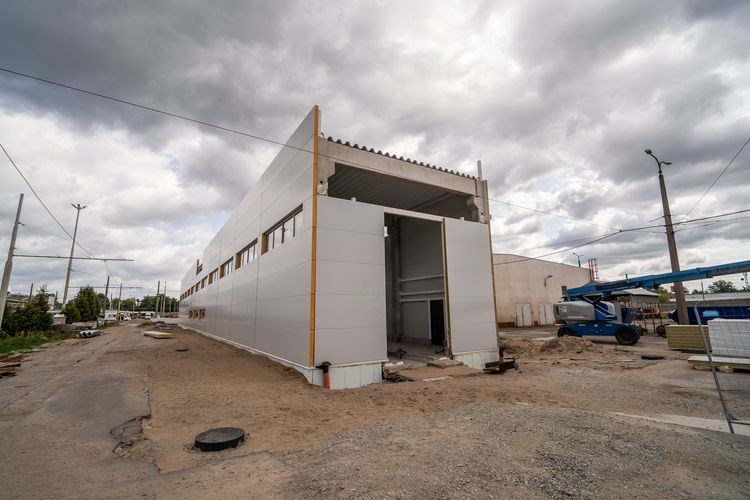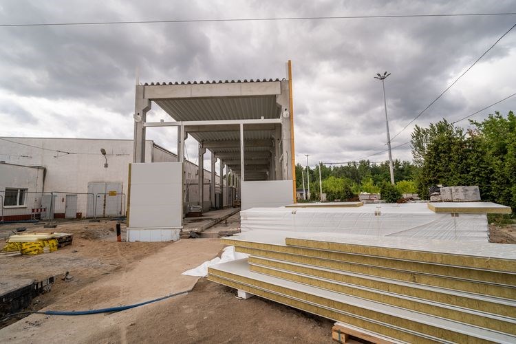 Ukończony został budynek portierni z trafostacją. Zaawansowane prace prowadzone są przy budynku pod reprofilację obręczy. Na płyta fundamentowej zmontowano prefabrykowane słupy i belki tworzące konstrukcję obiektu. Trwa zabudowa ścian płytami warstwowymi. Ukończona została też konstrukcja myjni (również z prefabrykowanych słupów i belek). Generalnym wykonawcą jest firma Mirbud. Zaawansowanie rzeczowe prac zbliża się do 60 %.