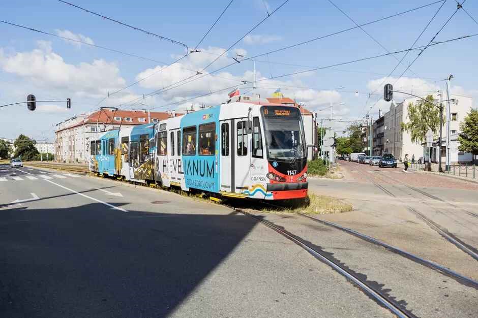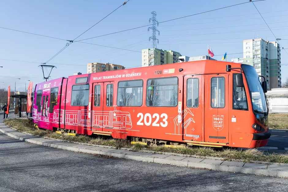 Z magenty w czerwień strażacką (i od rysunku tramwaju konnego po współczesny elektryczny) przechodził zaś pojazd przygotowany na cześć 150 lat obecności tramwajów w Gdańsku (2023 rok).