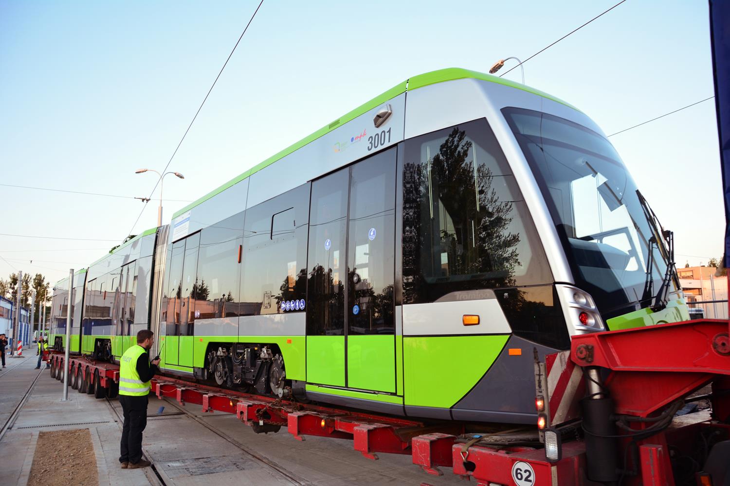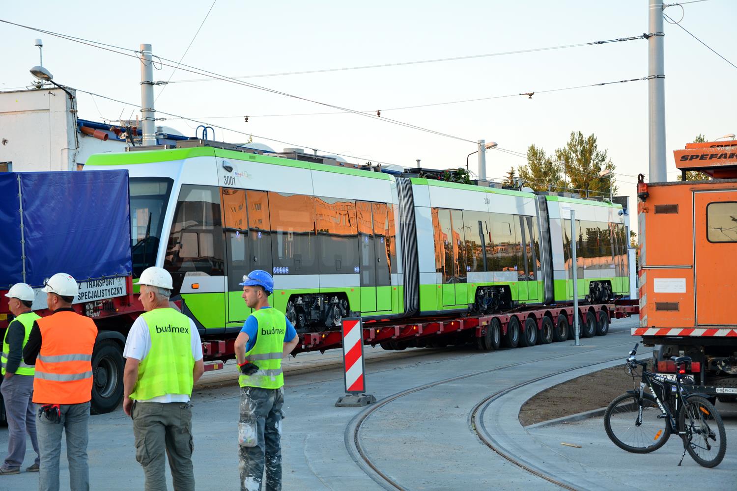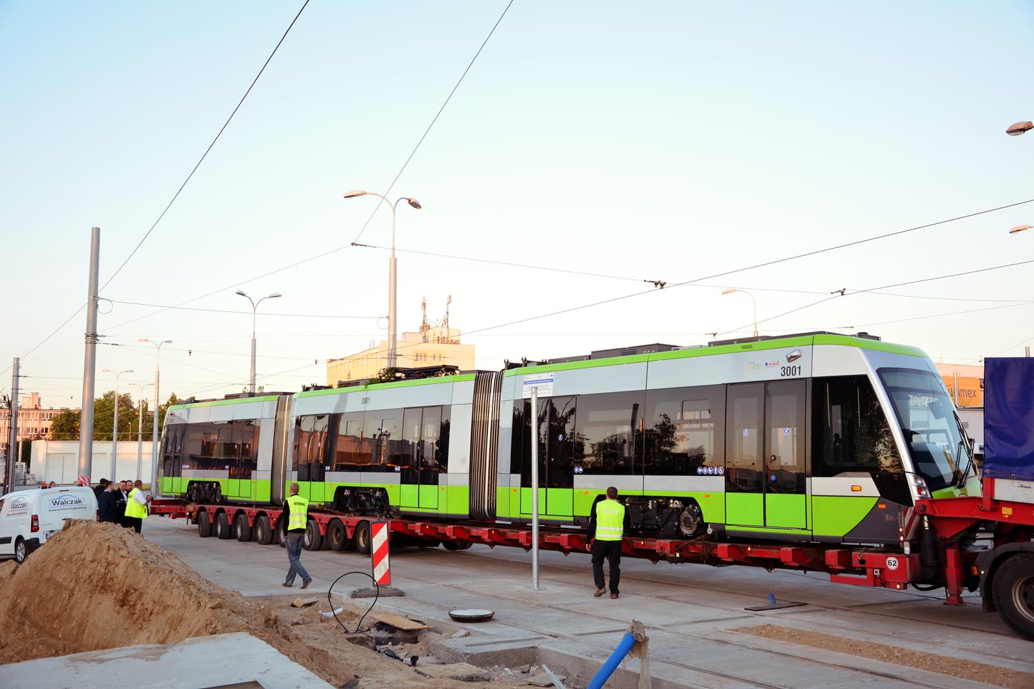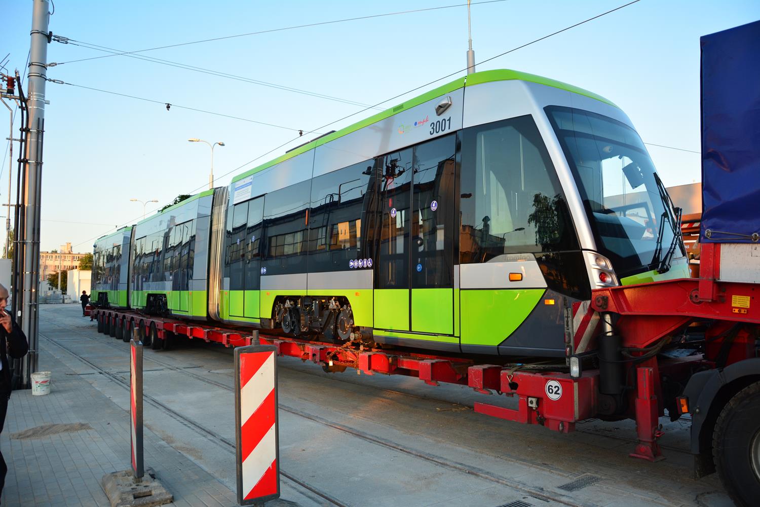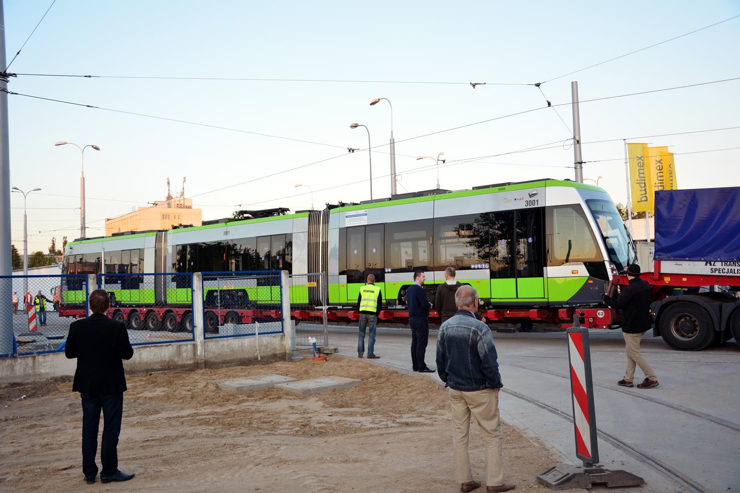 Na tę chwilę czekali nie tylko urzędnicy, ale i mieszkańcy. W końcu dotarł pierwszy tramwaj, który stał się symbolem i niezaprzeczalnym faktem, że w Olsztynie naprawdę będą jeździły pojazdy szynowe. Spora liczba gapiów powitała o tak wczesnej porze pierwszy skład Solarisa Tramino ubranego w srebrno-limonkowe barwy. Pojazd oznakowano numerem taborowym 3001. Na lawecie przywieziono go od strony Butryn. Następnie m.in. ulicami Płoskiego, Wyszyńskiego i Leonharda do Towarowej.