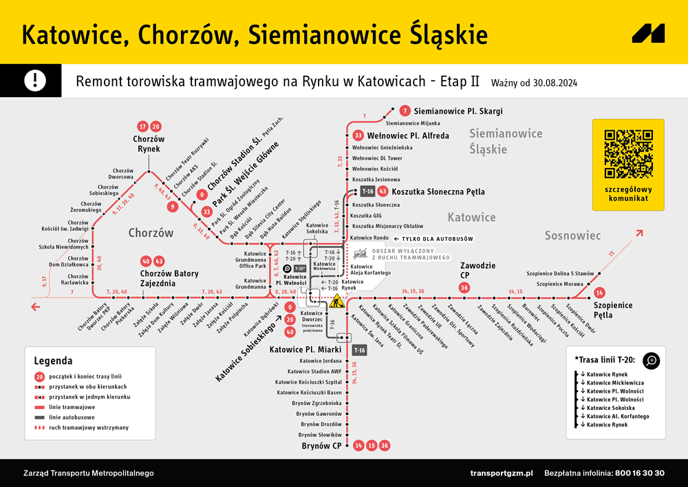 Przywrócenie ruchu tramwajów od Brynowa do Zawodzia oraz wstrzymanie ruchu tramwajów na odcinku Katowice Rondo – Katowice Rynek – Katowice Pl. Wolności to dwie najważniejsze informacje dla pasażerów komunikacji miejskiej. Zmiana organizacji ruchu oznacza nowe trasy dla sześciu linii tramwajowych – 0, 7, 14, 15, 20 i 40, wznowienie kursowania tramwajów na linii 36 (Zawodzie CP – Brynów CP) oraz zawieszenie linii tramwajowej 16. Dla zminimalizowania utrudnień, uruchomione zostaną cztery tymczasowe linie. Będą to dwie linie tramwajowe – zwykła 33 (Wełnowiec Pl. Alfreda – Park Śląski Wejście Główne) i weekendowa 43 (Koszutka Słoneczna – Katowice Grundmanna – Chorzów Batory Zajezdnia) oraz dwie linie zastępczej komunikacji autobusowej, tj. T-20 (Katowice Rynek – Katowice Plac Wolności – Katowice Al. Korfantego) oraz T-16 (Koszutka Słoneczna Pętla – Katowice Pl. Miarki).