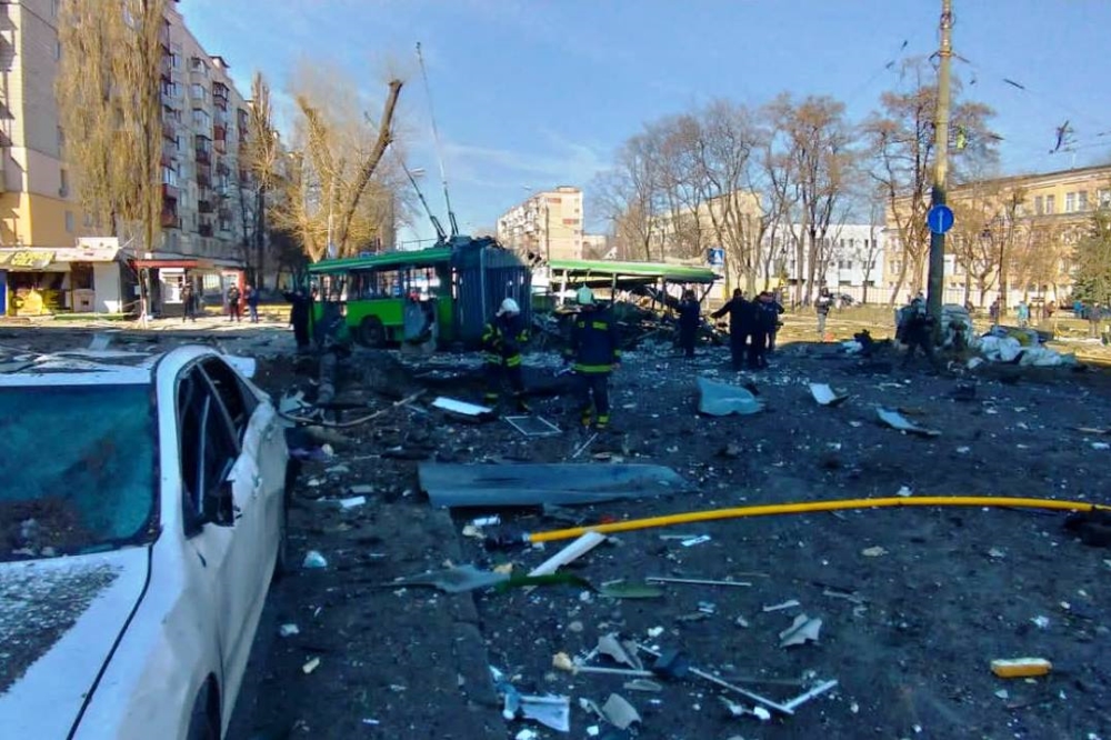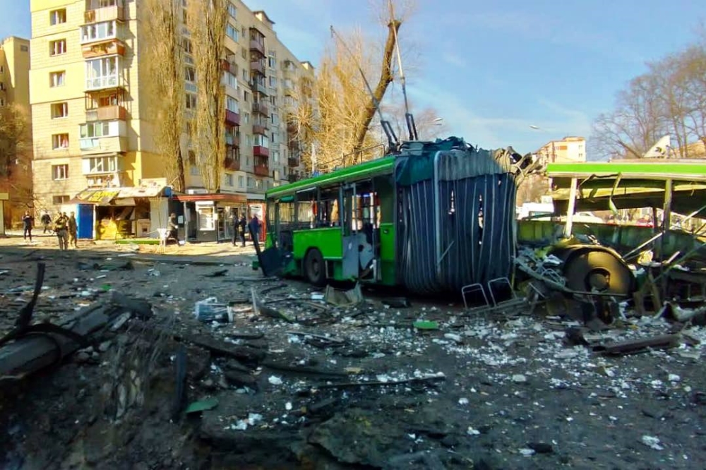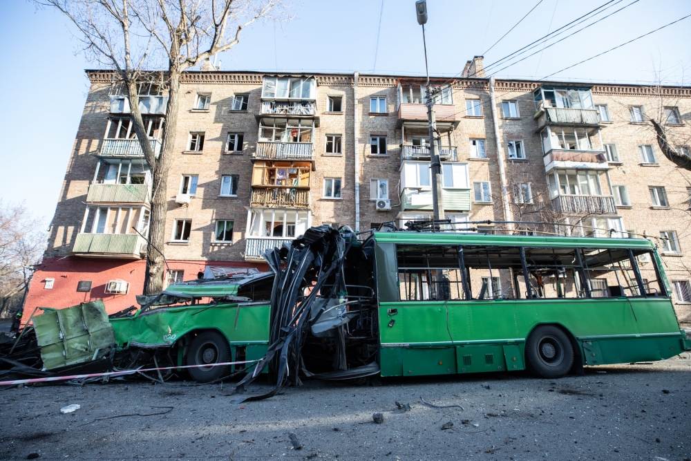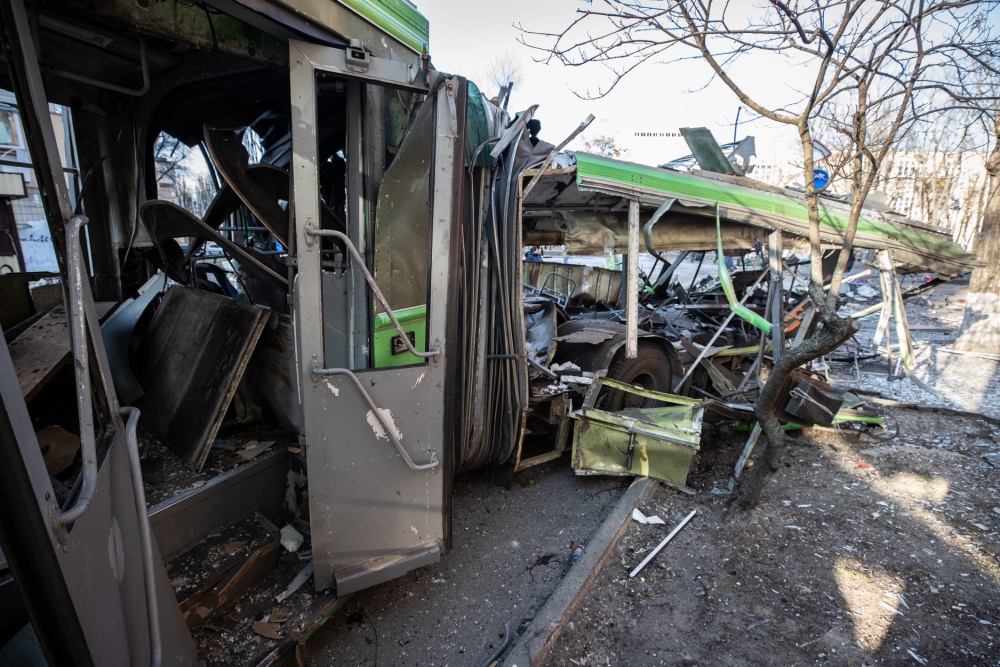 Wczoraj (14 marca) ułamki rakiety spadły na ulicę w dzielnicy Kureniowka na ul. Kyryliwśkiej. Uszkodzone zostały kamienica oraz stojący na ulicy trolejbus, na szczęście bez pasażerów. Zniszczony trolejbus to pojazd nr 3072 serii Kiew-12.03, wyprodukowany przez firmę Awiant – filię Antonowa. Pojazd najpewniej został ustawiony jako barykada. Jedna osoba zginęła, a sześć zostało rannych.