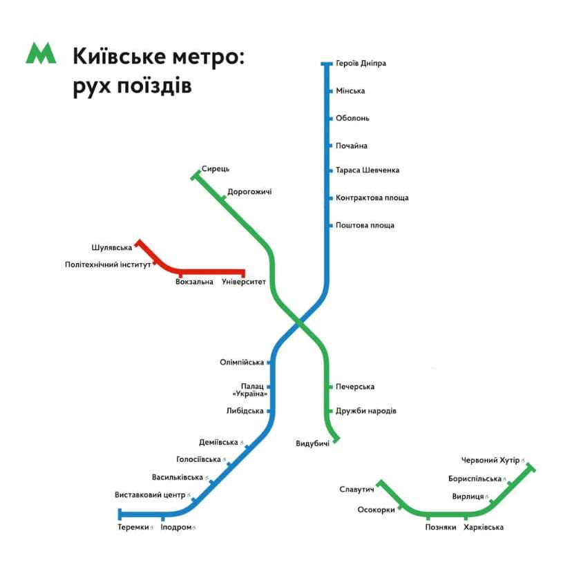 Metro w Kijowie jeździ obecnie w godz. 8-19. Ruch pociągów odbywa się w ograniczonym zakresie. Na czerwonej linii pociągi jeżdżą od stacji Szulawska do stacji Uniwersytet. Na niebieskiej linii pociągi kursują od stacji Teremki do stacji Herojiw Dnipra bez zatrzymywania się na stacjach przesiadkowych Majdan Nezałeżnosti i Płoszcza Lwa Tołstoho. Na zielonej linii pociągi kursują od stacji Syreć do stacji Wydubyczi oraz od stacji Sławutycz do stacji Czerwonyj chutir. Pociągi nie zatrzymują się na stacjach Łukjaniwśka, Zołoti worota, Pałac sportu i Kłowśka. Oba metromosty są zamknięte, nie ma możliwości przesiadki między liniami. Pociągi kursują co ok. 40 minut.