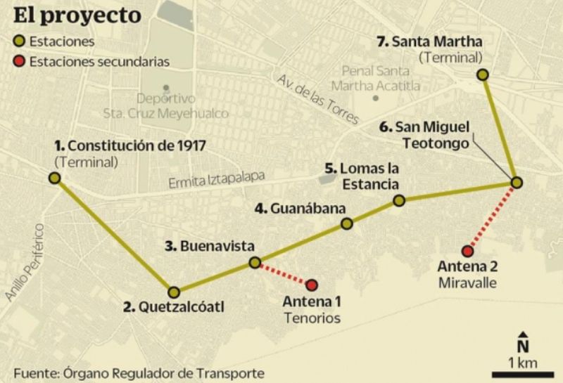 Linia nr 2 poprowadzona zostanie ze stacji Constitución de 1917 do innej końcowej Santa Marta. Stacjami pośrednimi będą Quetzalcoatl, Buenavista, Minas, Lomas de la Estancia i San Miguel Teotongo. Podróż przez wszystkie siedem stacji ma trwać 40 minut, a dogodne przesiadki zyskają użytkownicy metra linii nr 8 i A, a także wydzielonej na estakadach linii trolejbusu nr 8.