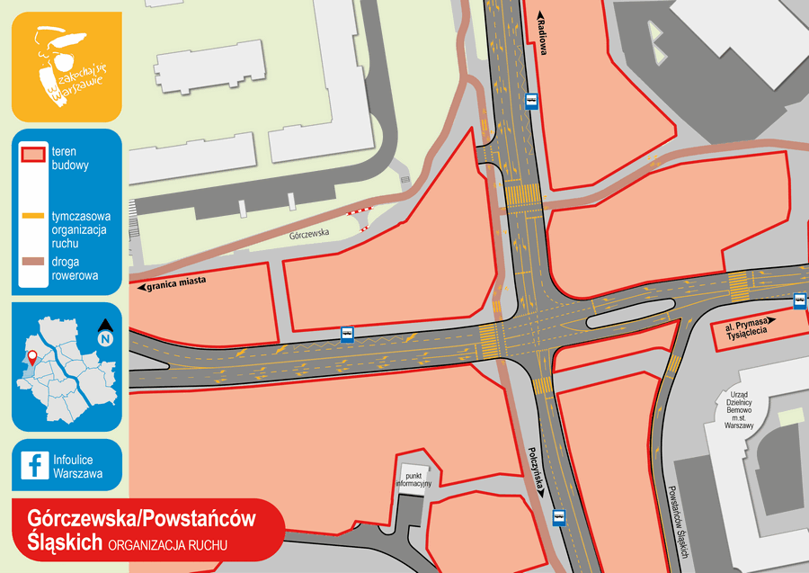 Inaczej przez skrzyżowanieWschodnia jezdnia ul. Powstańców Śląskich zostanie zamknięta dla ruchu na odcinku pomiędzy ul. Konarskiego a Bolkowską. Po stronie Urzędu Dzielnicy Bemowo pozostanie wyłącznie jeden pas ruchu umożliwiający skręt w prawo w ul. Górczewską. Ruch na wprost przez skrzyżowanie z ul. Górczewską w stronę obwodnicy (al. Obrońców Grodna) zostanie skierowany na jezdnię zachodnią, na której kierowcy będą mieli do dyspozycji po jednym pasie ruchu w każdym kierunku. Kierowcy jadący w stronę obwodnicy przejadą na drugą jezdnię na wysokości ul. Konarskiego, a na właściwą jezdnię wrócą na wysokości skrzyżowania z ulicami Bolkowską i Pełczyńskiego. Utrzymana będzie możliwość skrętu na parking przed sklepem oraz w ulice Bolkowską i Pełczyńskiego.