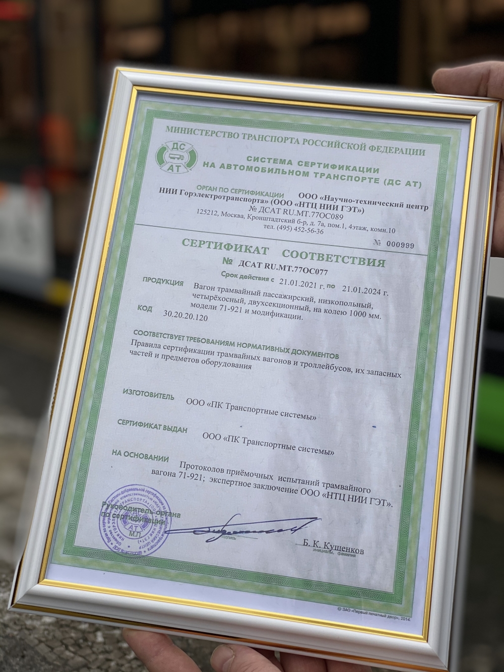 Jak informuje producent, w poniedziałek 25 stycznia prototypowy Korsarz otrzymał certyfikat międzyresortowej komisji, przygotowany przez Instytut Naukowo-Badawczy Gorelektrotransportu i umożliwiający uruchomienie produkcji seryjnej. Podczas oficjalnej uroczystości wręczył go Anton Alichanow, gubernator Obwodu Kaliningradzkiego. Oznacza to, że pojazd przeszedł pomyślnie wszystkie kontrole państwowe i testy, które rozpoczęły się pod koniec grudnia w Kaliningradzie. Sprawdzano m.in. geometrię, skrajnię, osiągi trakcyjne i związane ze zużyciem energii, czas przyspieszania, właściwości hamowania. Opracowano też listę poprawek, która pozwoli na wyeliminowanie drobnych niedociągnięć czy poprawę właściwości tramwaju.