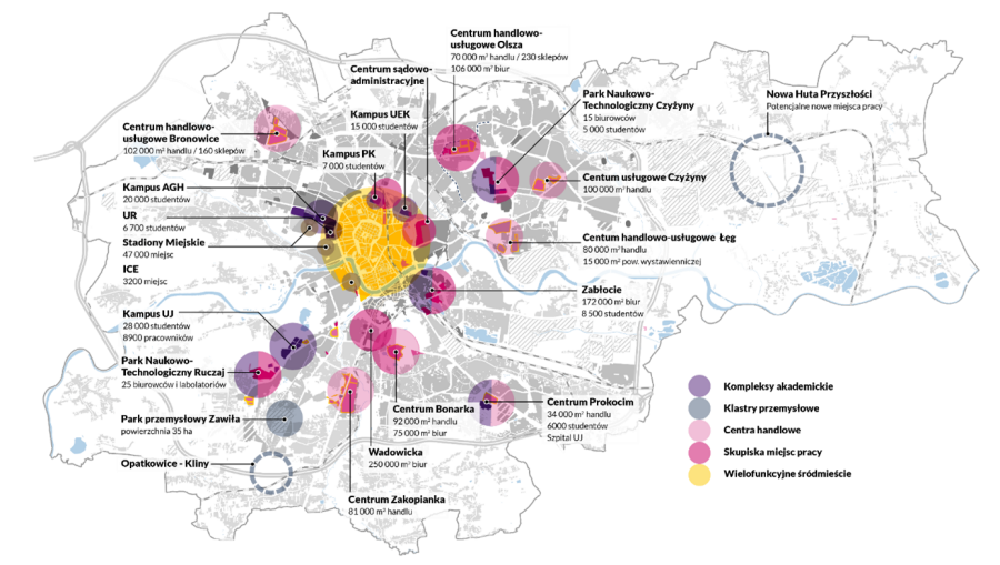 Zespół zidentyfikował najpoważniejsze generatory ruchu – największe osiedla mieszkalne, obszary akademickie, działalności gospodarczej i miejsc pracy, a także największe obszary mieszkalne – także w ujęciu przyszłościowym. Jako szczególnie wymagające wskazano obszary Ruczaju, parków biurowych w okolicy ul. Wadowickiej oraz centrum handlowo-biurowego Bonarka, zaś na wschodzie miasta – kampusów i centrów usługowych w Czyżynach, a także potencjału rozwojowego terenów Kombinatu.
