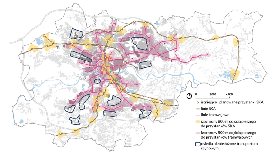 Przez uwarunkowania transportowe, w tym w szczególności dostęp do transportu szynowego, wskazano obszary, które mierzą się z największymi wyzwaniami komunikacyjnymi. To przede wszystkim tereny zlokalizowane na południu (w tym osiedle Kliny, część Ruczaju, Swoszowic) oraz na północnym-wschodzie (Czyżyny, osiedle Avia).