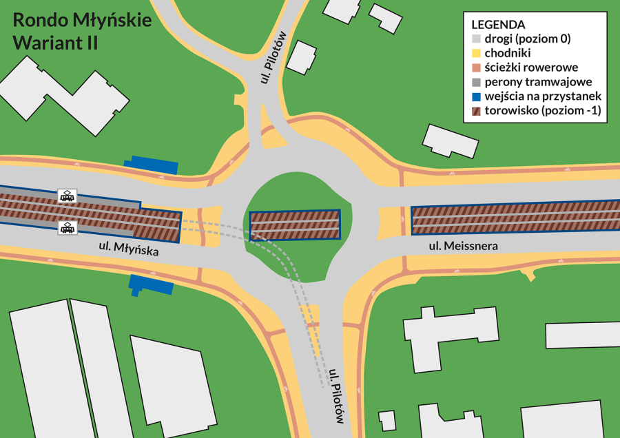 Kluczowym elementem projektowanej linii jest tunel, który zapewni bezkolizyjny, a więc szybszy i bezpieczniejszy przejazd tramwaju na newralgicznym odcinku. Jeden z wariantów zakłada, że tramwaj będzie rozpoczynał zjazd na poziom -1 przed rondem Młyńskim, gdzie torowisko poprowadzone będzie w zabezpieczonym wykopie. Przed rondem Polsadu przejdzie w tunel. Drugi z rozpatrywanych wariantów przewiduje zjazd do komory tunelu tuż za rondem Młyńskim.