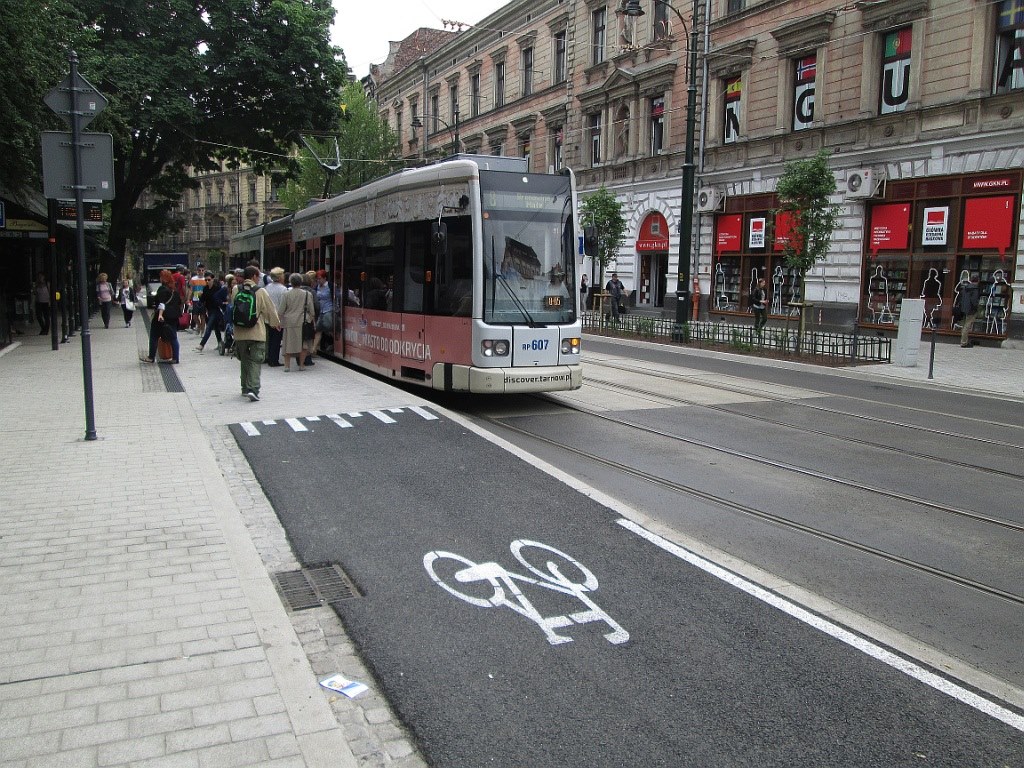 Pasażerowie na kontrapasieCzy innowacyjne krakowskie rozwiązanie sprawdzi się w praktyce? To się okaże. Wiedeński przystanek rowerowy pod względem technicznym i konstrukcyjnym jest bez zarzutu. W trakcie kilku dni funkcjonowania działał poprawnie, nawet w godzinach popołudniowego szczytu nie wywołując konfliktów między przejeżdżającymi kontrapasem na ul. Podwale cyklistami a pasażerami komunikacji miejskiej. Należy jednak mieć na uwadze fakt, iż trwa okres wakacyjny, w trakcie którego notuje się znaczny spadek liczby osób korzystających z transportu zbiorowego. W roku akademickim sytuacja może wyglądać inaczej. Nie wiadomo również, jak będzie z obsługą