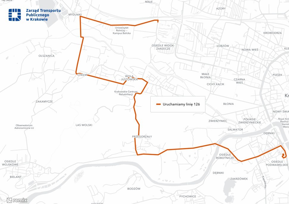 - Uruchomienie linii 126 z Bronowic Małych przez Mydlniki, Chełm, Al. Kasztanową, Starowolską i Księcia Józefa do Os. Podwawelskiego. Zupełnie nowe połączenie na zachodzie miasta eliminujące białe plamy dostępności do KMK, ale również pomagające mieszkańcom Woli Justowskiej i Przegorzał w komunikacji pomiędzy dzielnicami, w tym dojeździe dzieci do szkół. Linia będzie kursować z częstotliwością co 30 minut przez wszystkie dni w tygodniu. Docelowo, po zakończeniu przebudowy ulicy Kościuszki, zakłada się skierowanie linii na Salwator, co pozwoli zwiększyć jej częstotliwość do 20 minut w godzinach szczytów;